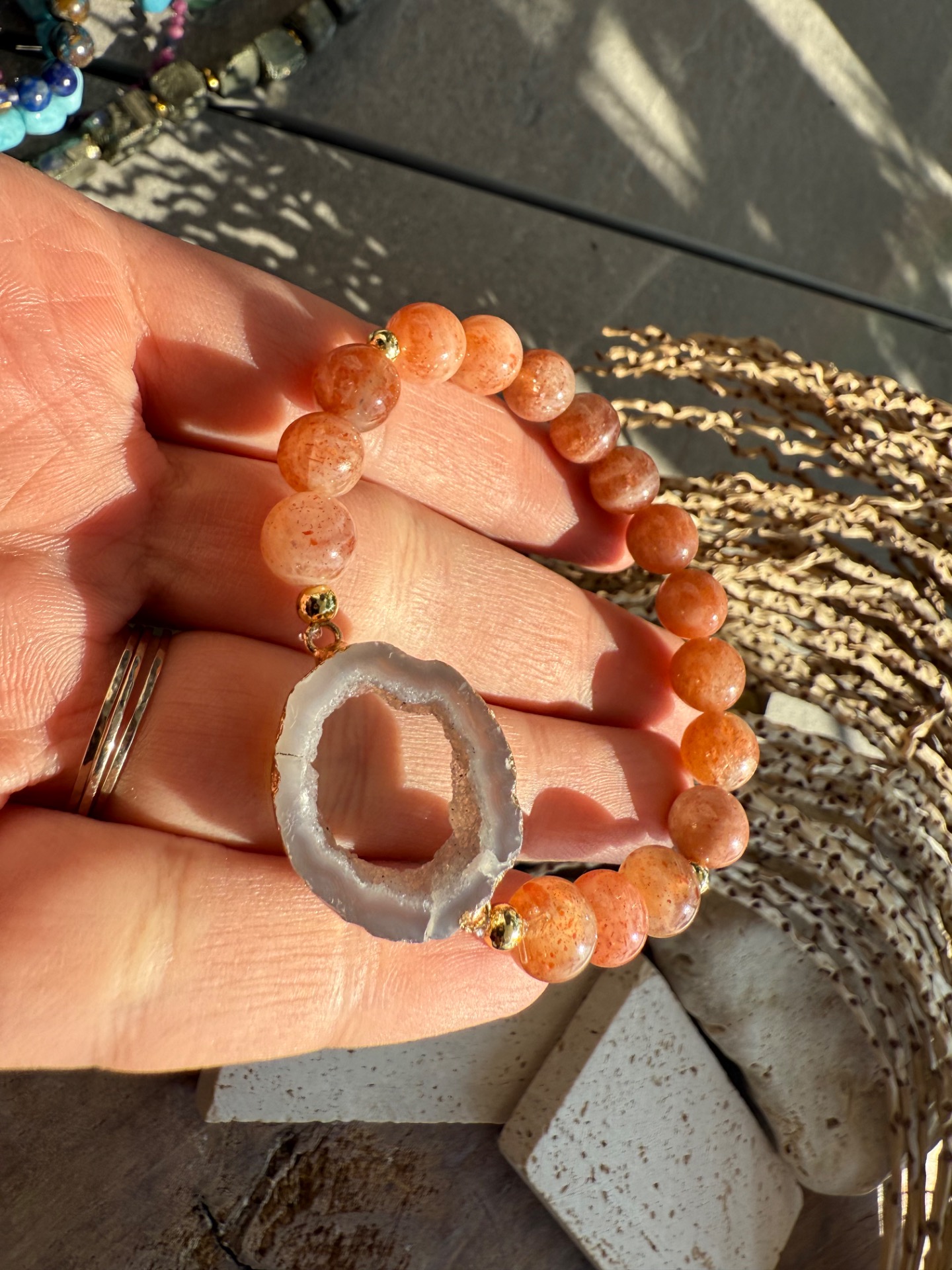 Spojenie slnečného kameňa a achátu vytvára krásnu rovnováhu medzi radosťou a pokojom. Náramok pôsobí veľmi prirodzene, elegantne a zároveň jemne boho – ako malý talizman pripomínajúci svetlo, teplo a ľahkosť letného dňa.