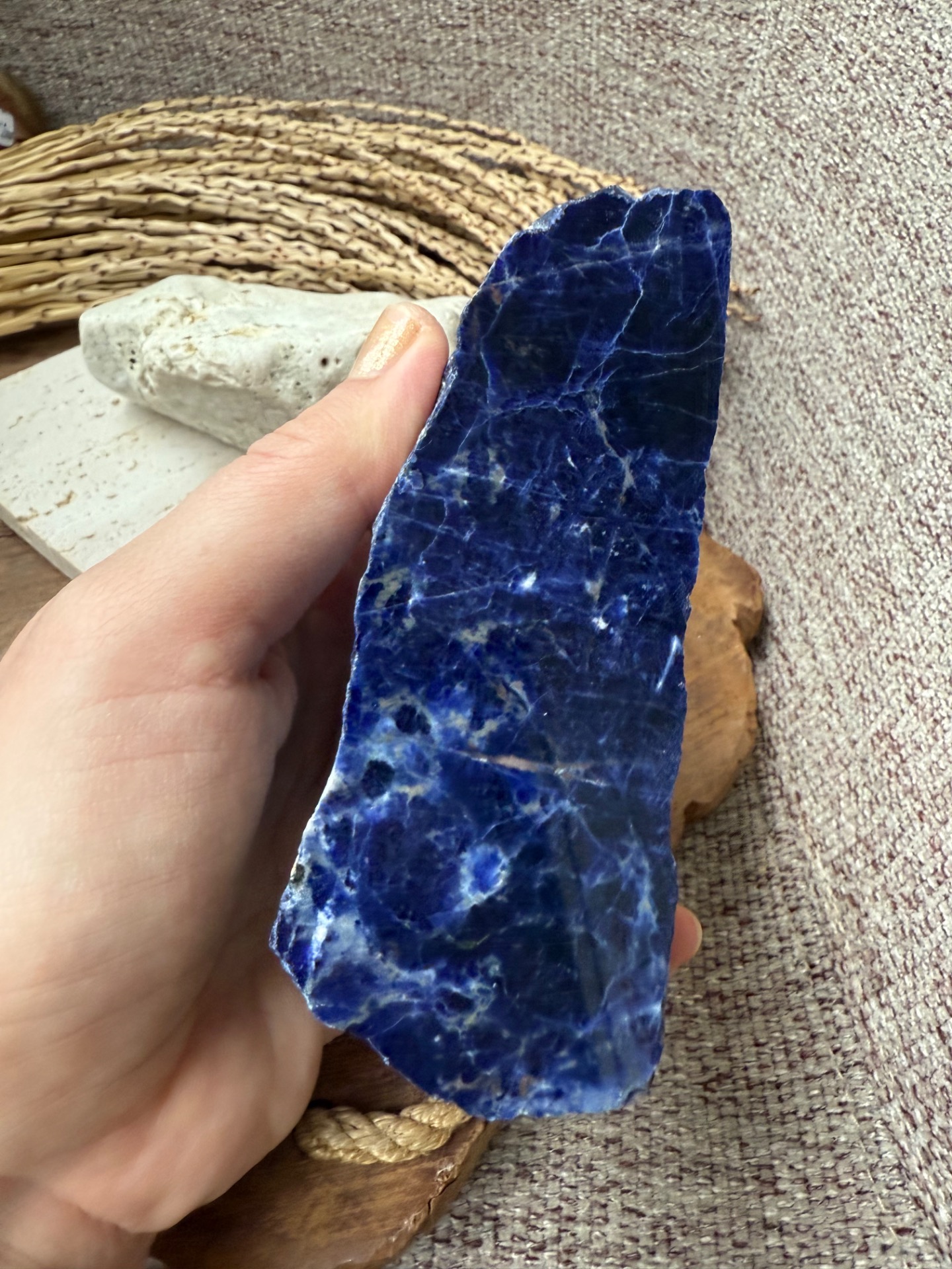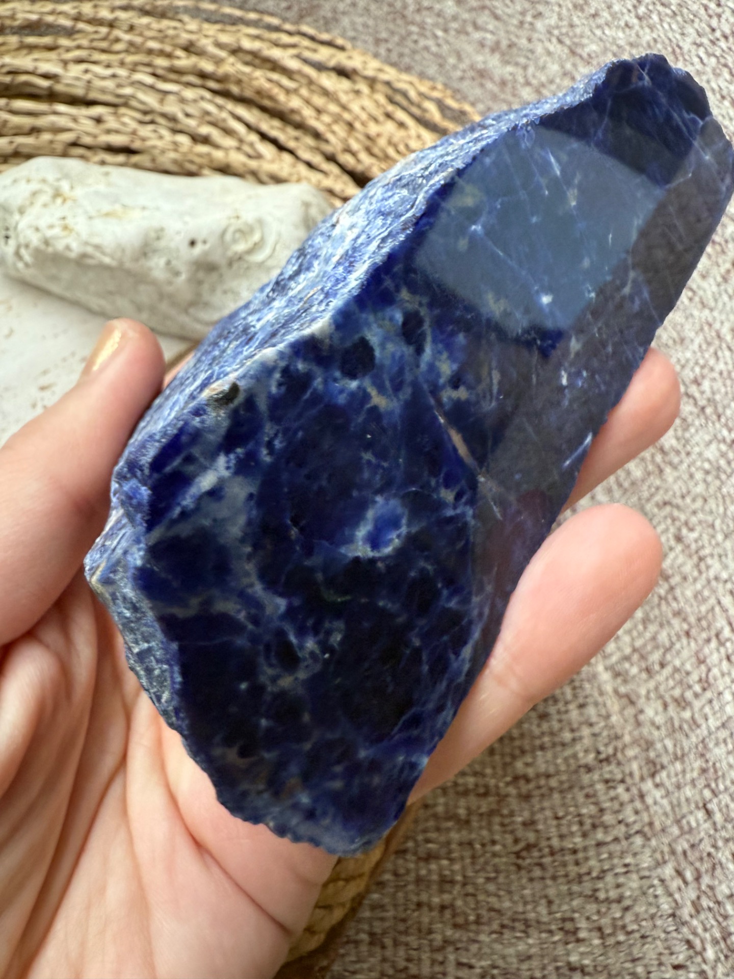 Tento sodalit kombinuje surovú energiu s jednou leštenou stranou, ktorá zosilňuje jeho vizuálnu i energetickú pôsobivosť. Je kameňom mysle, koncentrácie a vnútorného poriadku. Pomáha pri sústredení, učení a tvorivej práci, podporuje jasné myslenie a logické uvažovanie.