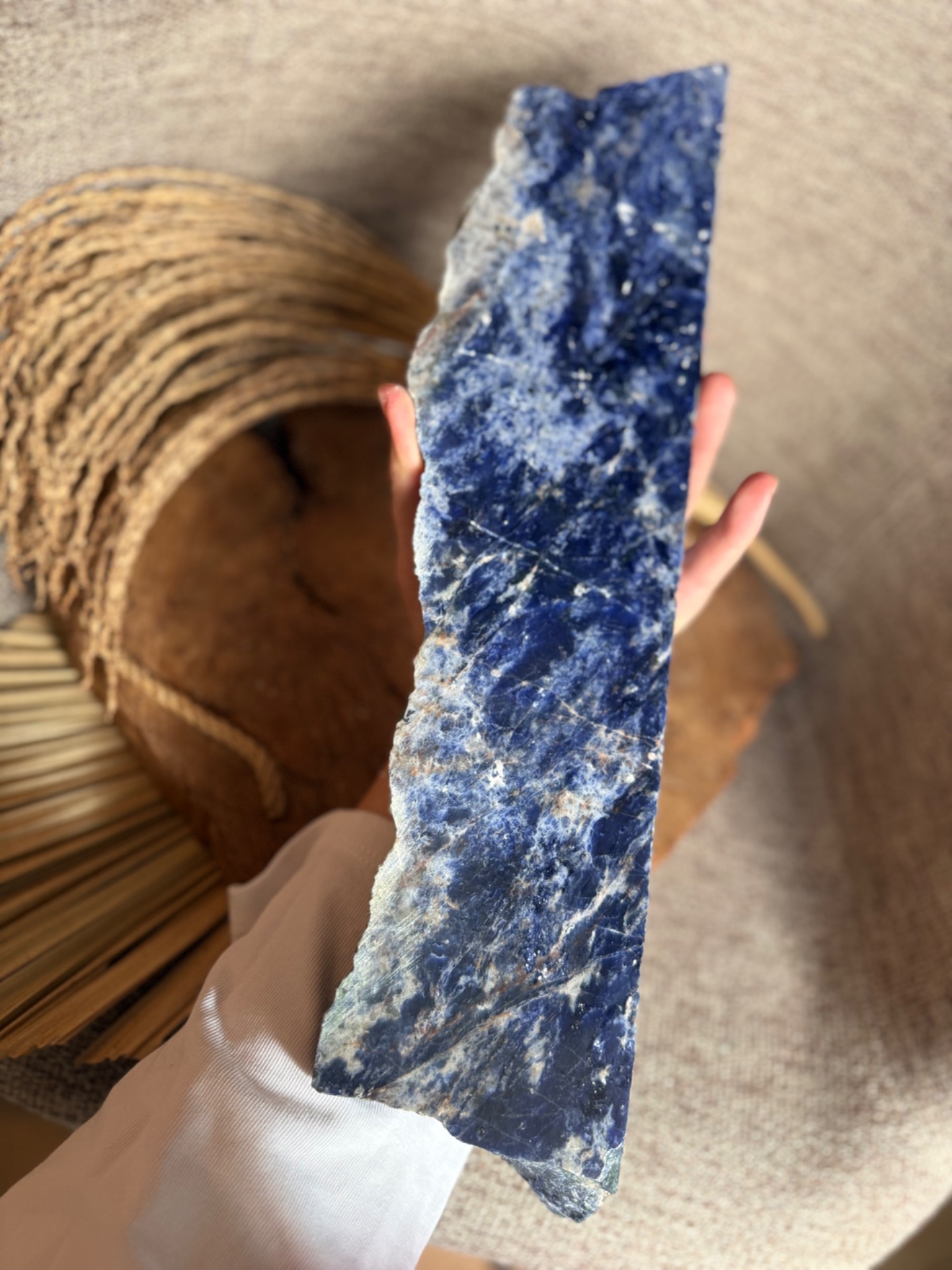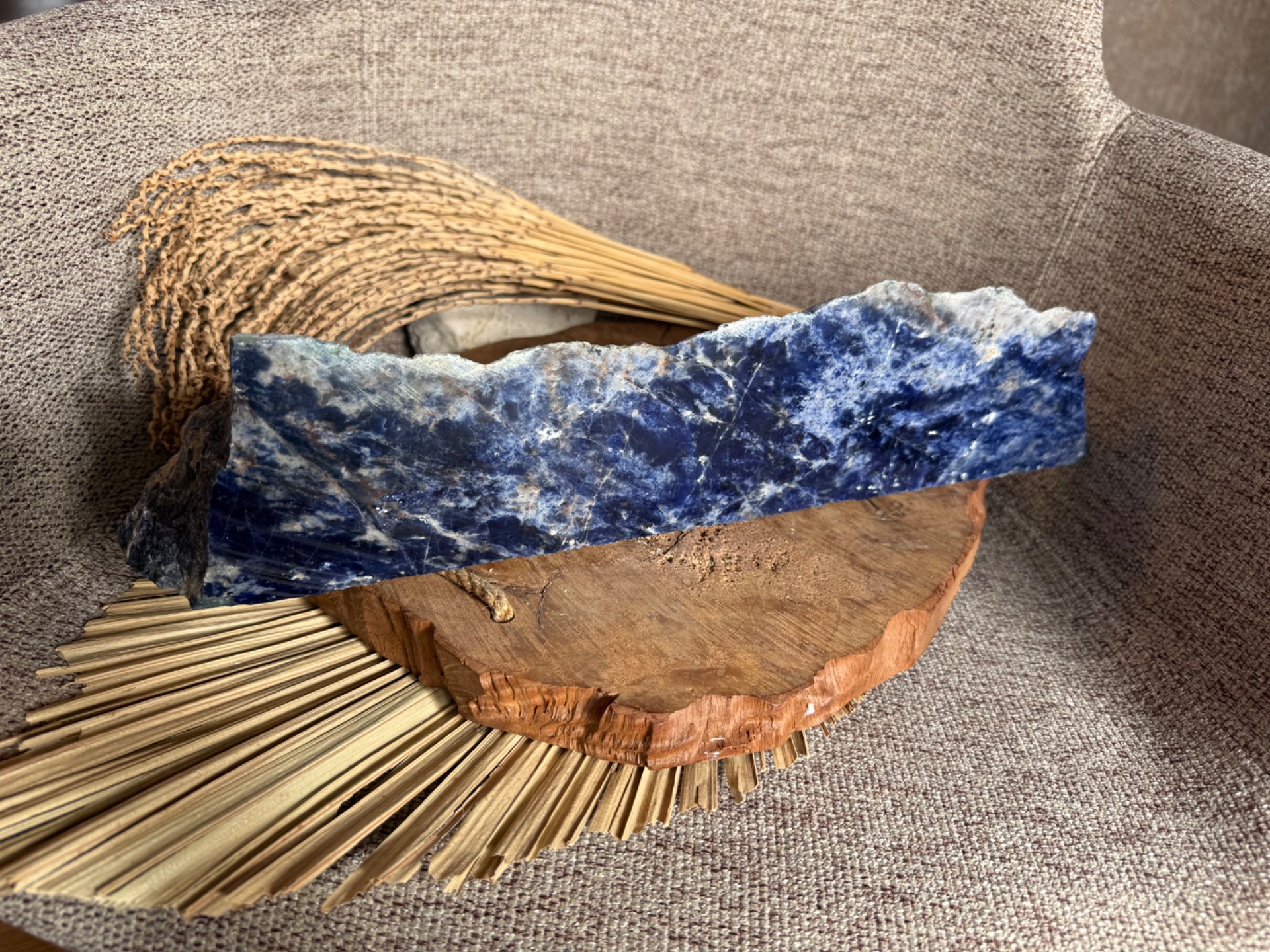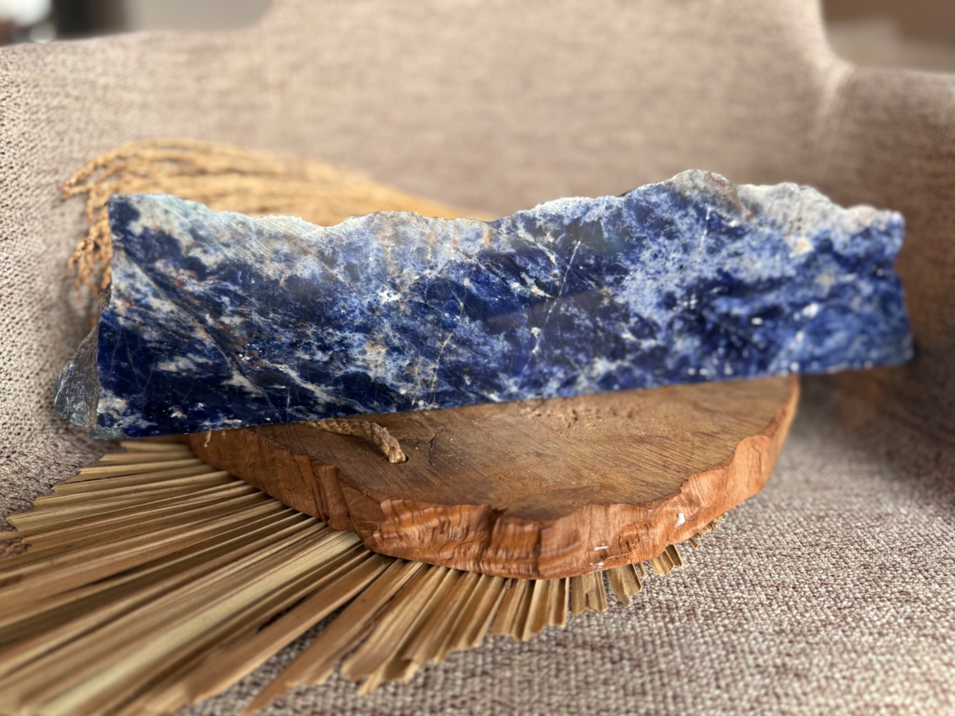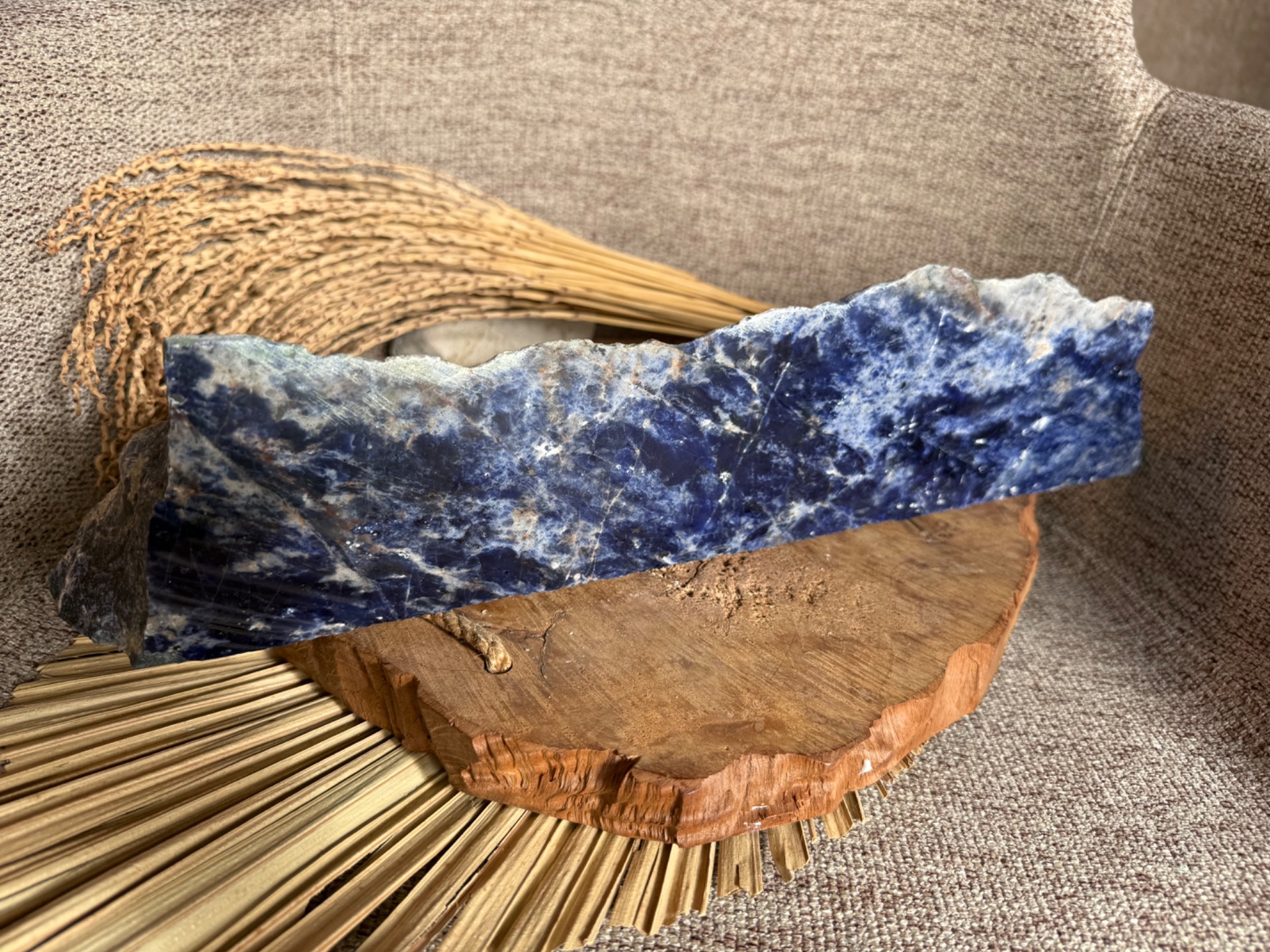 Objavte silu sodalitu, masívneho minerálu, ktorý podporuje jasnosť mysle, introspekciu a evolúciu vedomia. Tento kameň je jedinečný solitér – jedna strana je leštená, aby vynikol jeho nádherný modrý odtieň, zatiaľ čo ostatné časti sú ponechané v surovom stave, čím sa zachováva autentická krása minerálu.