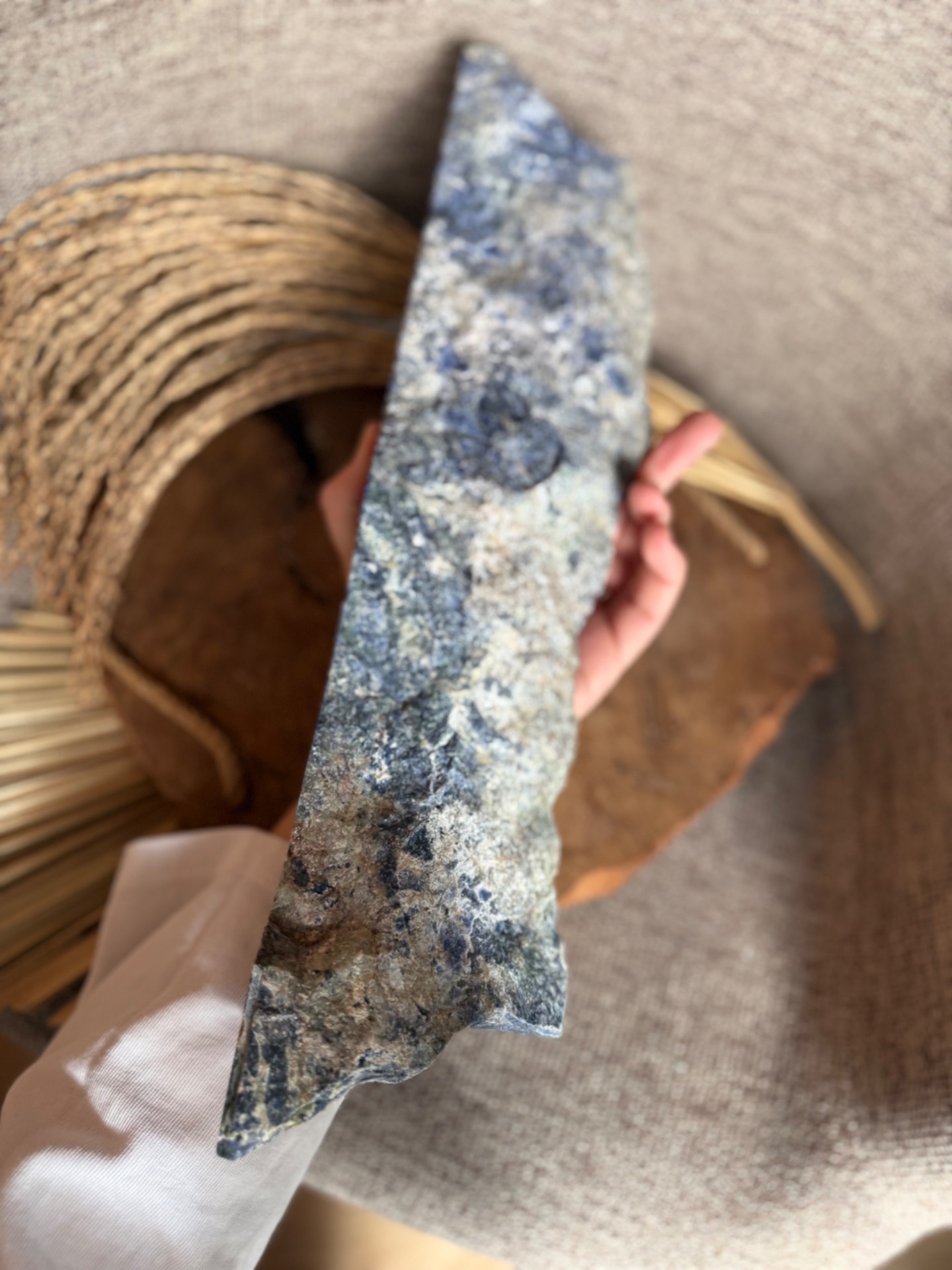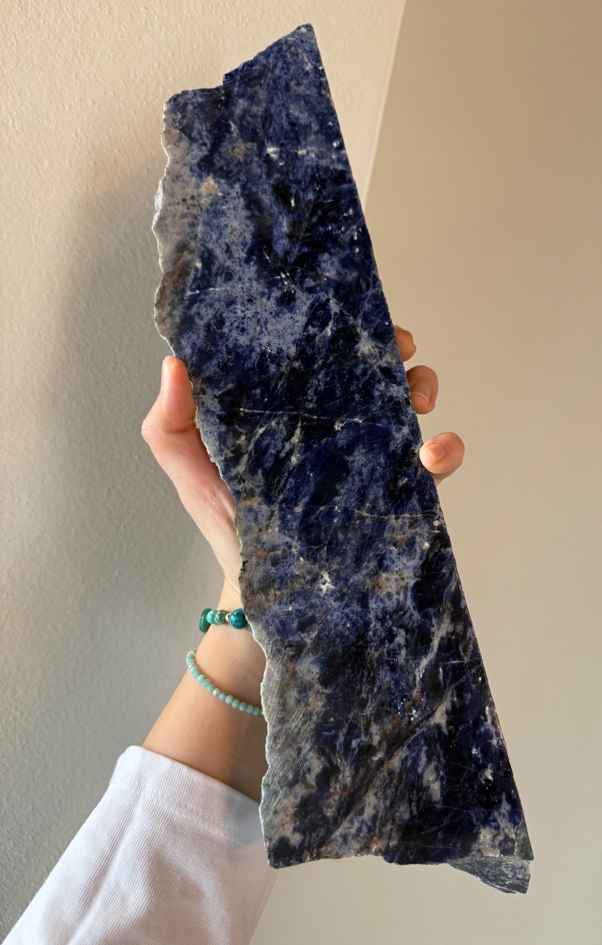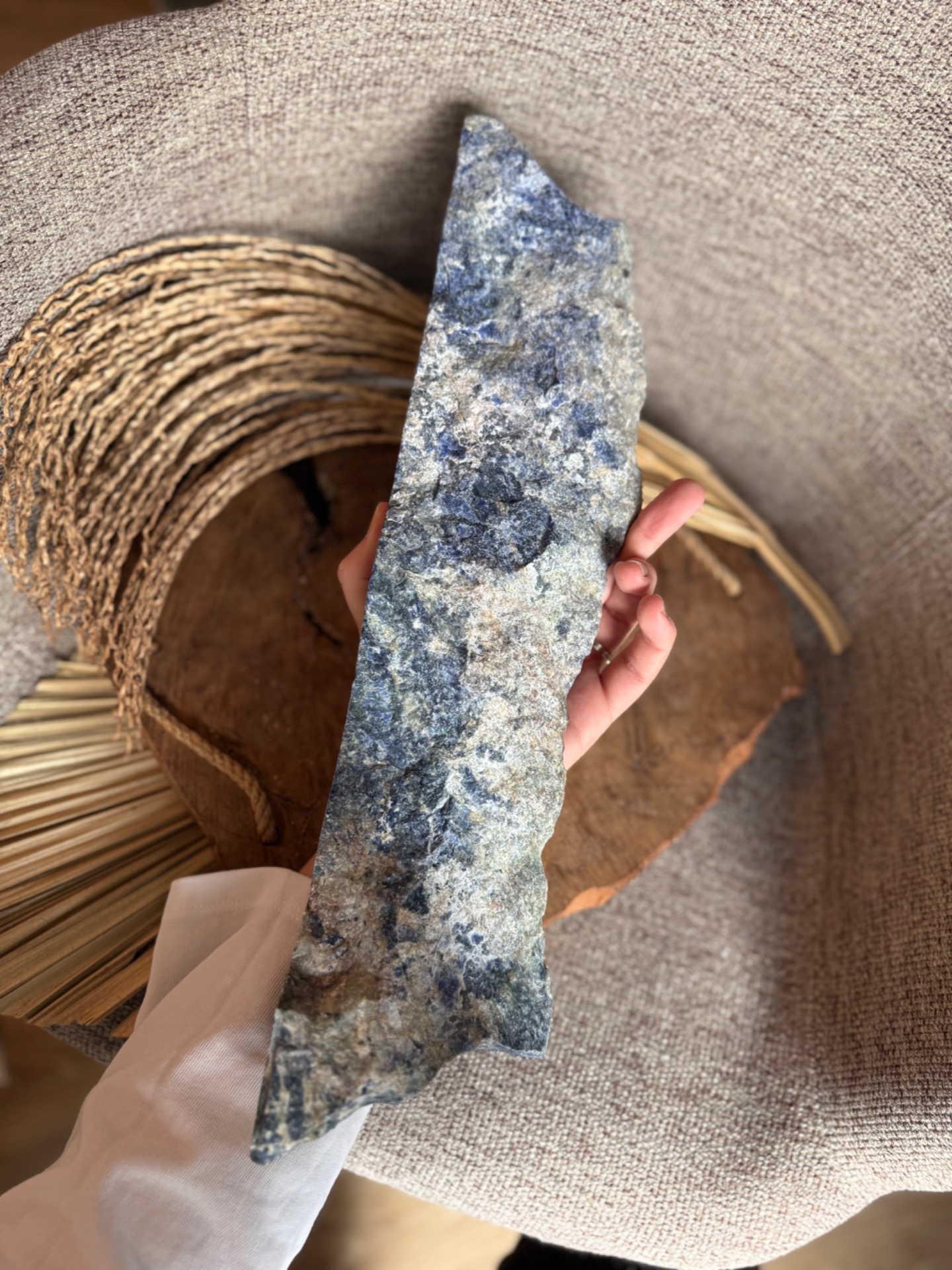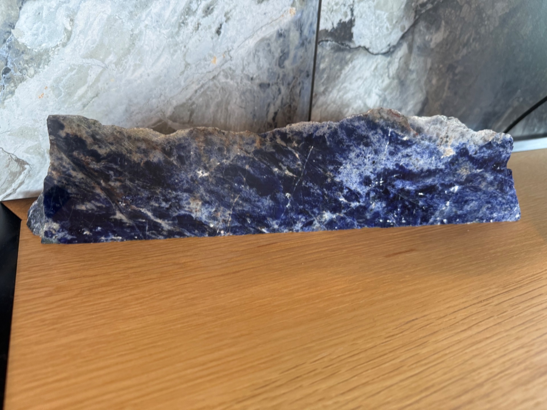 Objavte silu sodalitu, masívneho minerálu, ktorý podporuje jasnosť mysle, introspekciu a evolúciu vedomia. Tento kameň je jedinečný solitér – jedna strana je leštená, aby vynikol jeho nádherný modrý odtieň, zatiaľ čo ostatné časti sú ponechané v surovom stave, čím sa zachováva autentická krása minerálu.