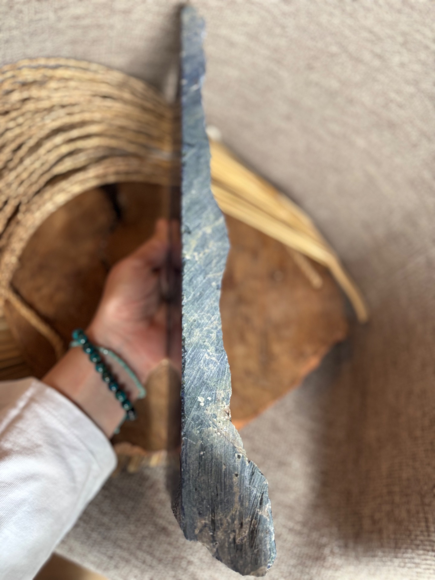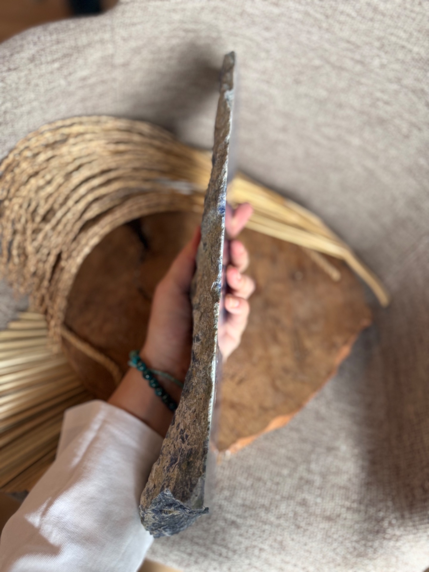 Vizualita a úprava: Jedna strana kameňa je leštená, aby vynikol jeho charakteristický modrý odtieň a lesk. Ostatné časti sú ponechané v surovom stave, čo zachováva autentickosť a prirodzenú štruktúru minerálu.