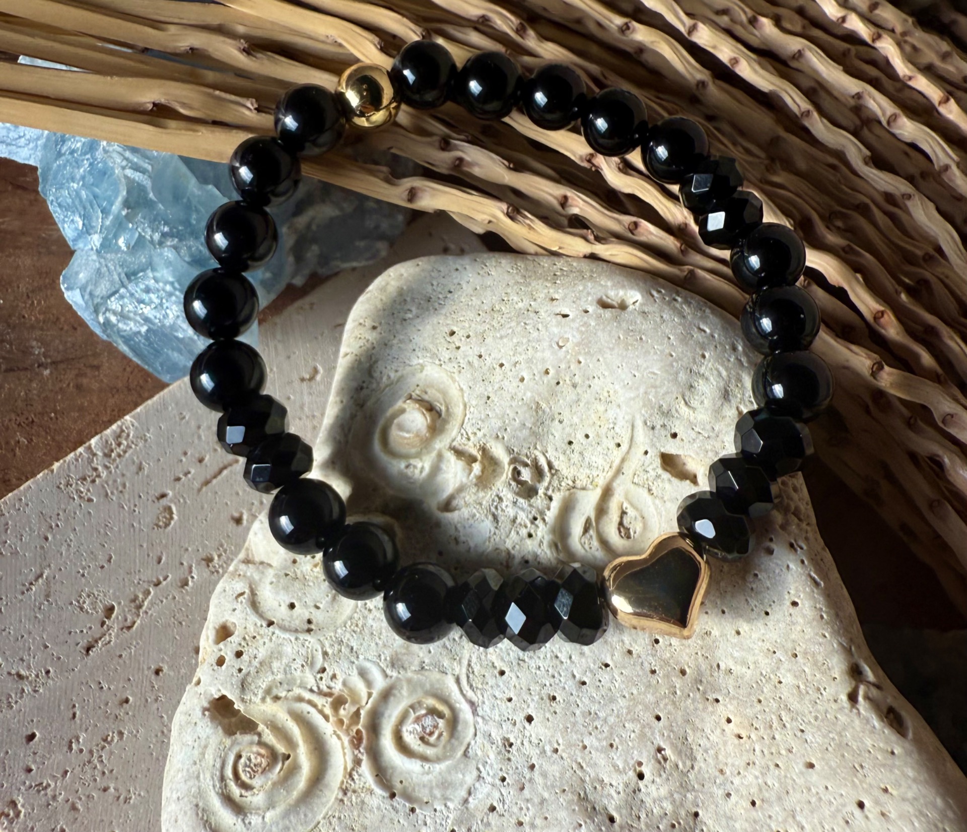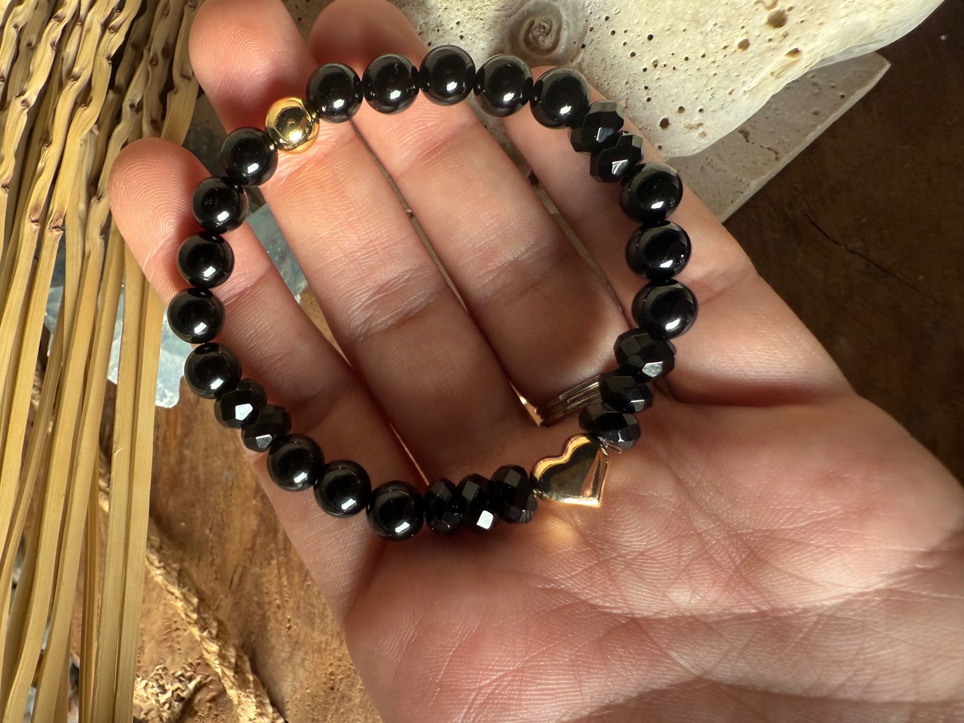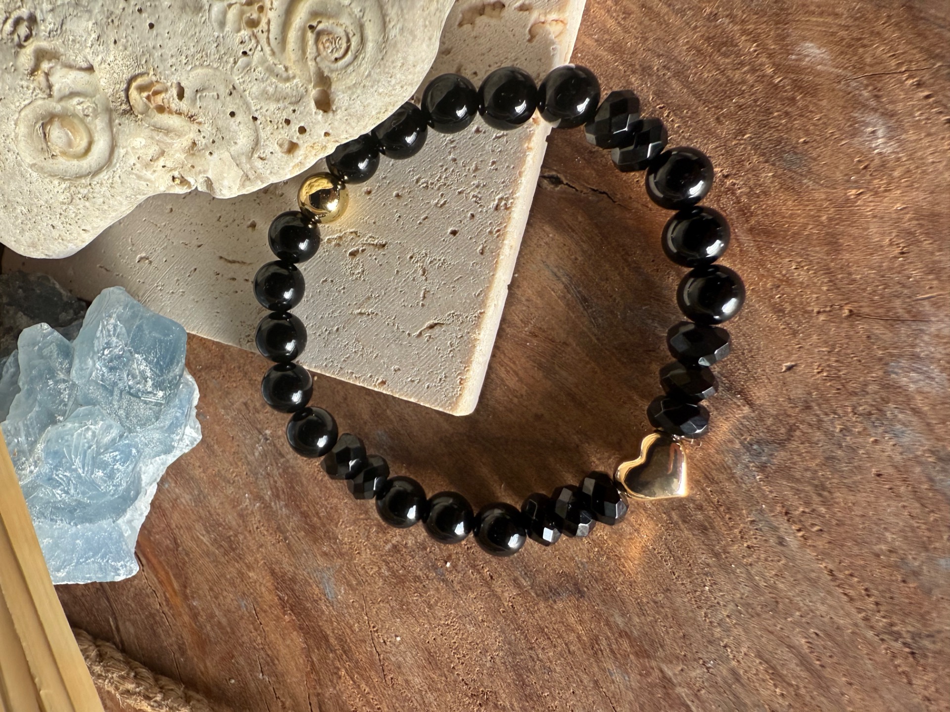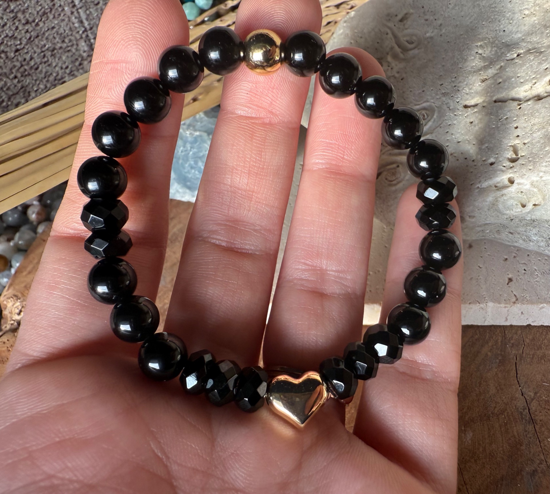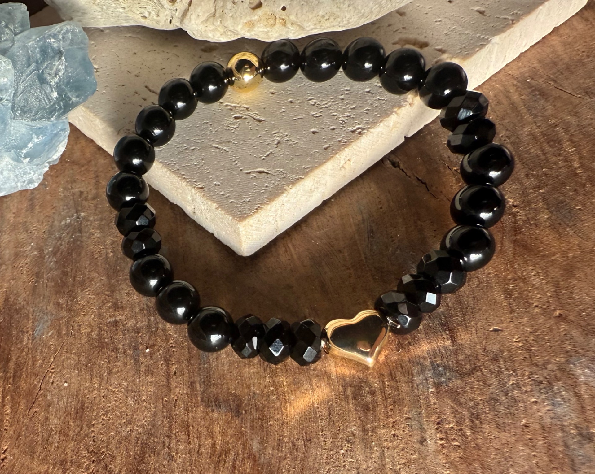 Láskavé srdce -náramok z čierneho ónyxu so zlatým srdiečkom
