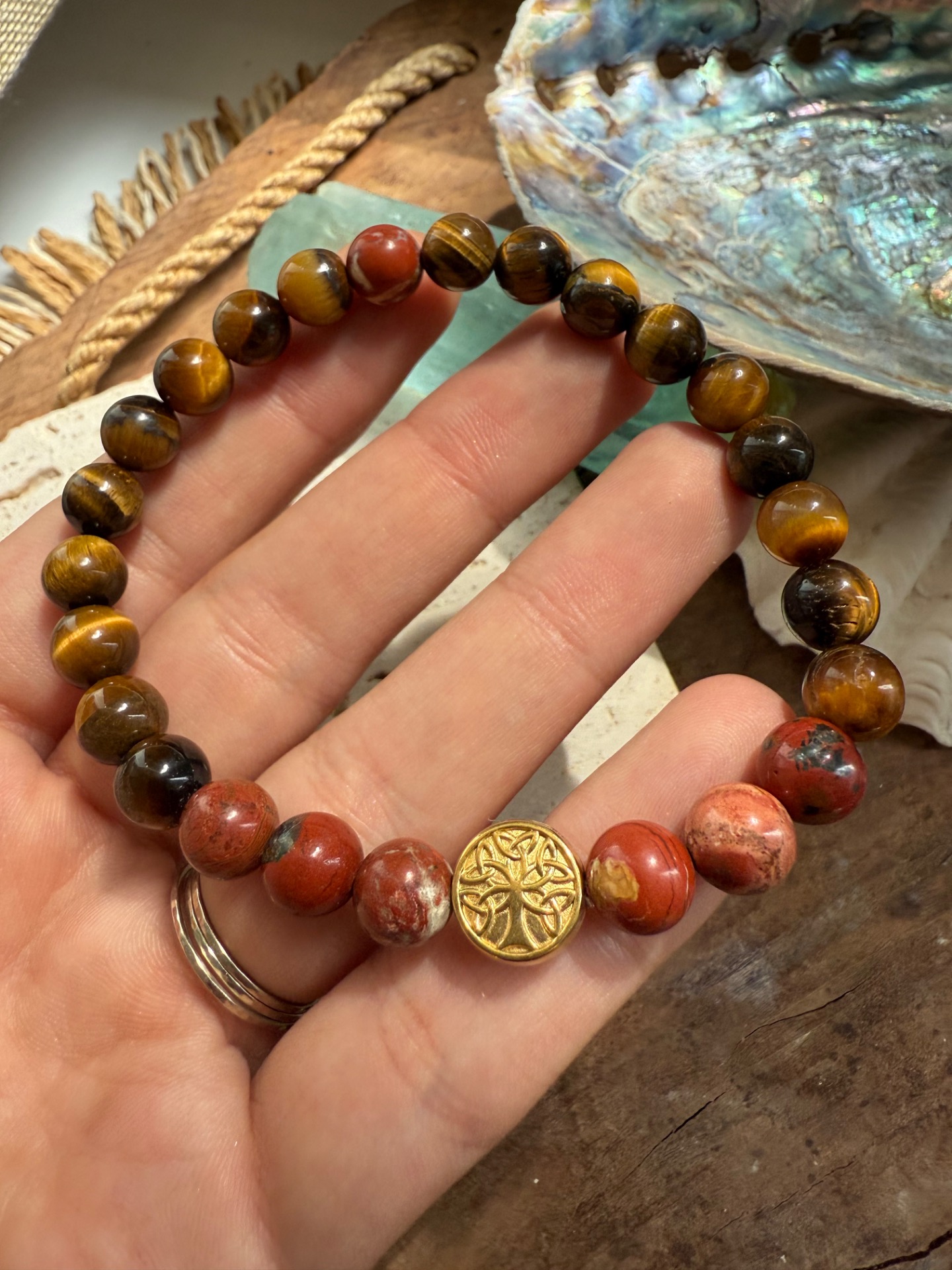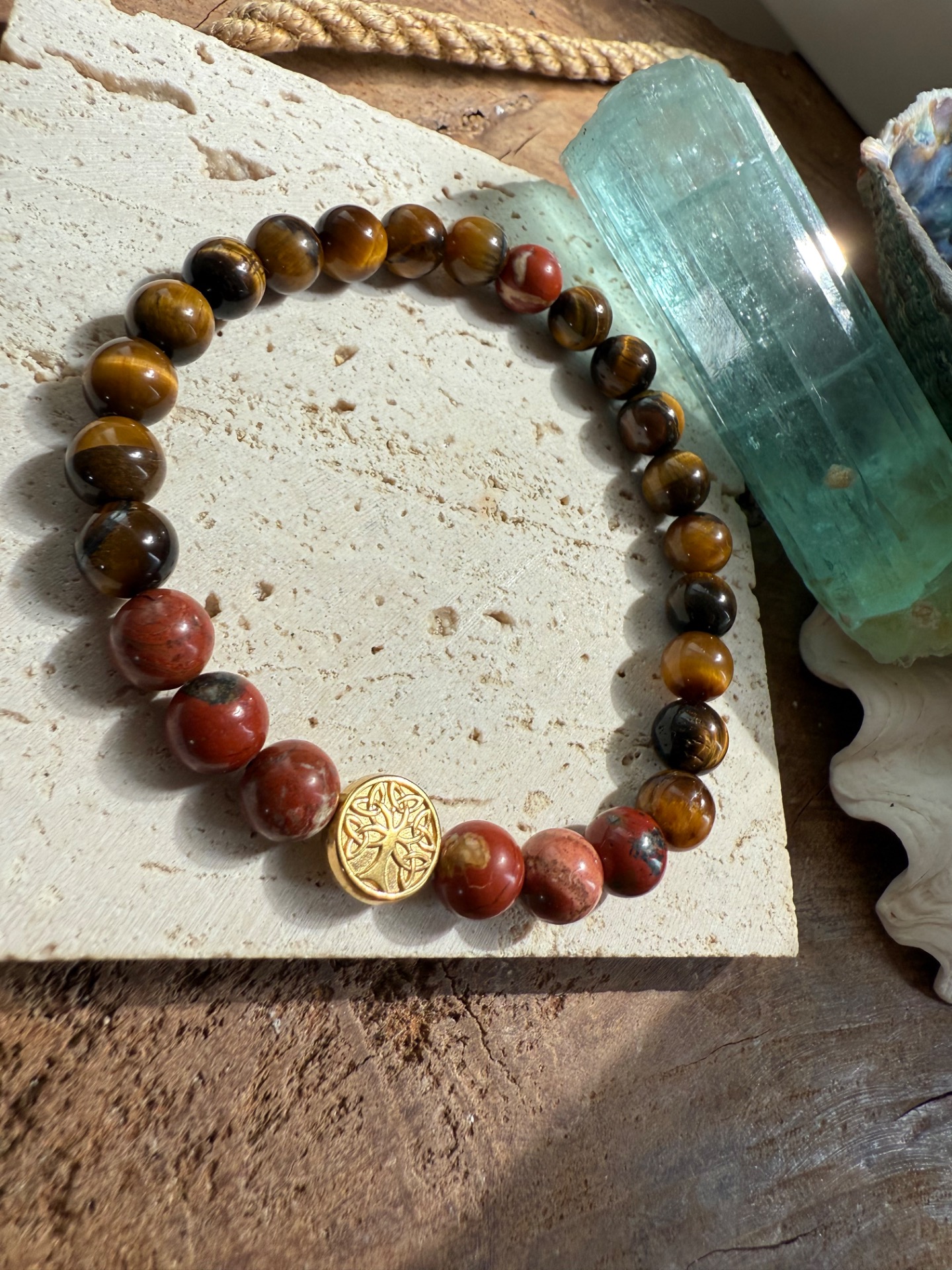 Tento pánsky náramok kombinuje ochrannú a stabilizujúcu energiu tigrieho oka s vitalitou a silou červeného jaspisu. Korálky o veľkosti 8 mm vytvárajú robustný a elegantný dizajn. Nerezový komponent v tvare stromu života dodáva hlbokú symboliku a náramok je vhodný na každodenné nosenie aj špeciálne príležitosti.
