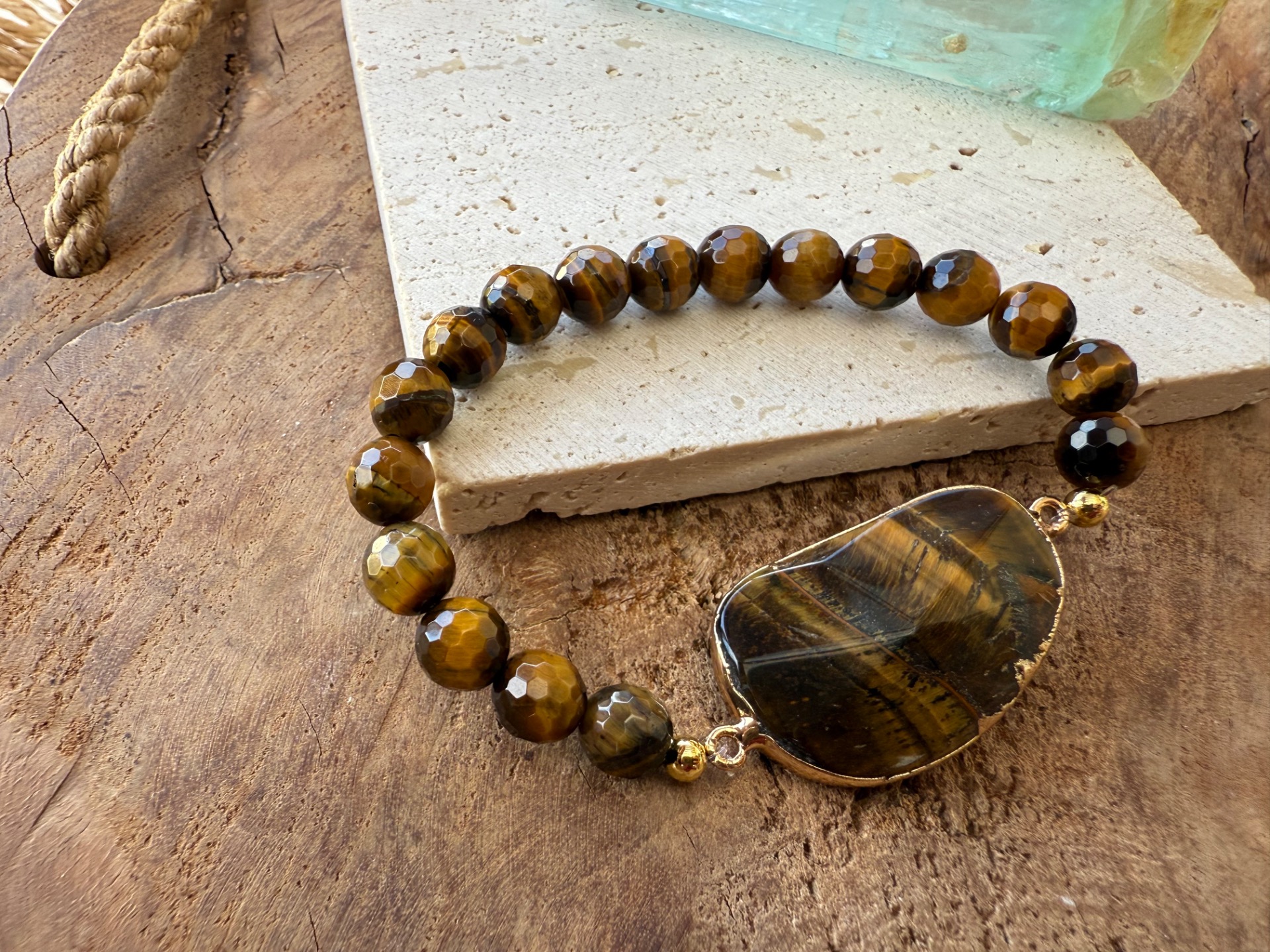 Náramok z minerálu tigrie oko placka doplnená korálkami z tigrieho oka 8mm,fazet výbrus.