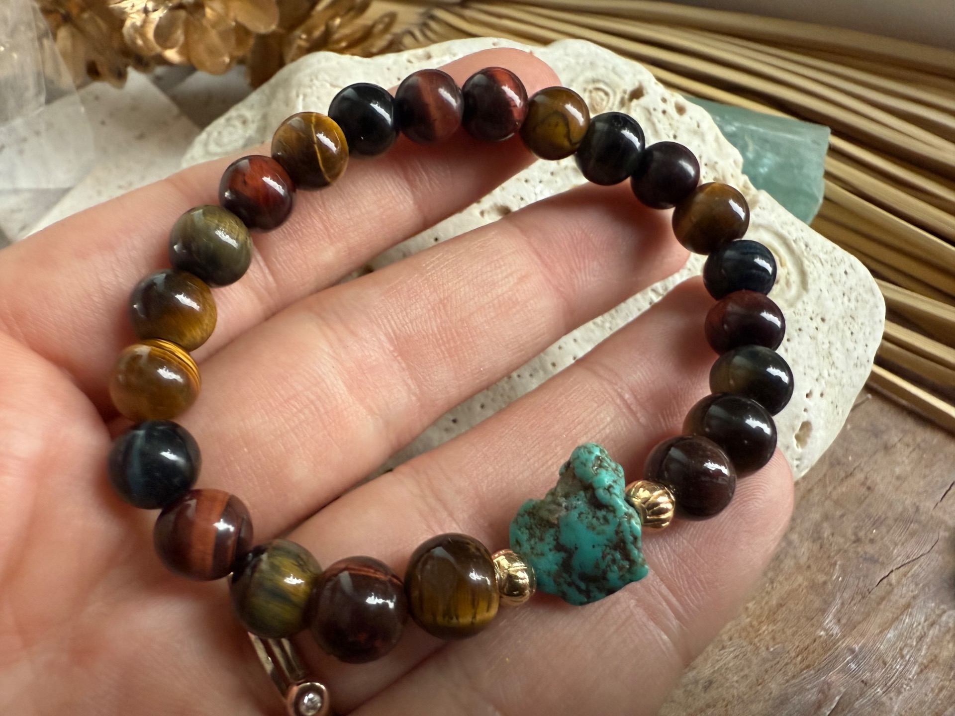 Náramok Oko Strážcu je silným ochranným talizmanom, ktorý spája tri formy "ochranných očí" – tigrie, býčie a sokolie oko – doplnené o jedinečný nuget tyrkysu Hubei. Táto kombinácia vytvára energiu videnia, odvahy a jasného smeru, akoby nad tebou neustále bdel strážca s ostrým zrakom a dobrou intuíciou.