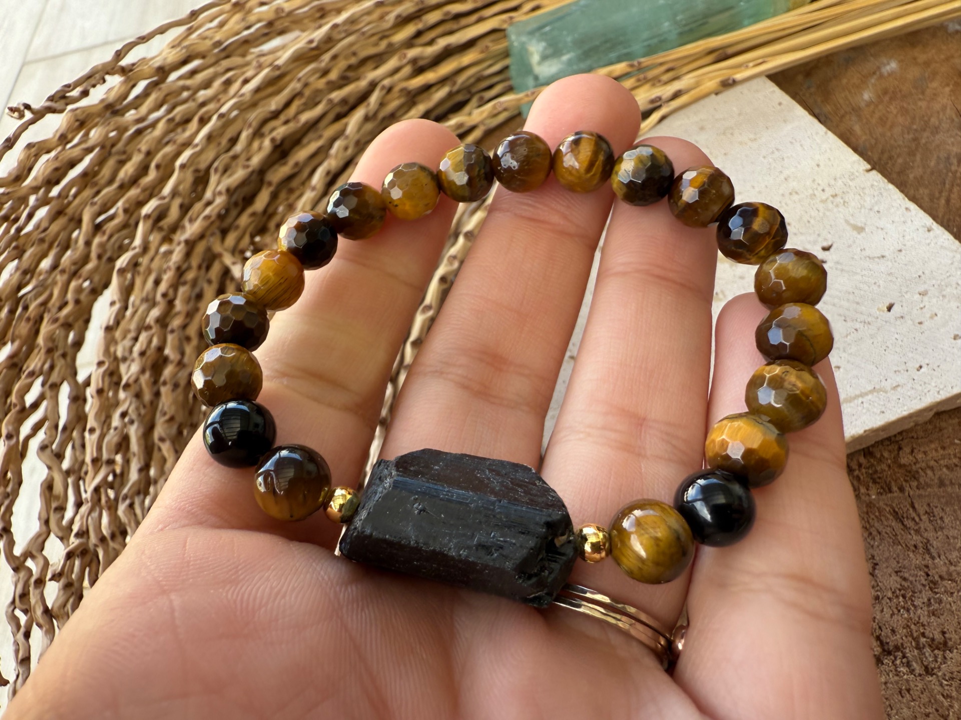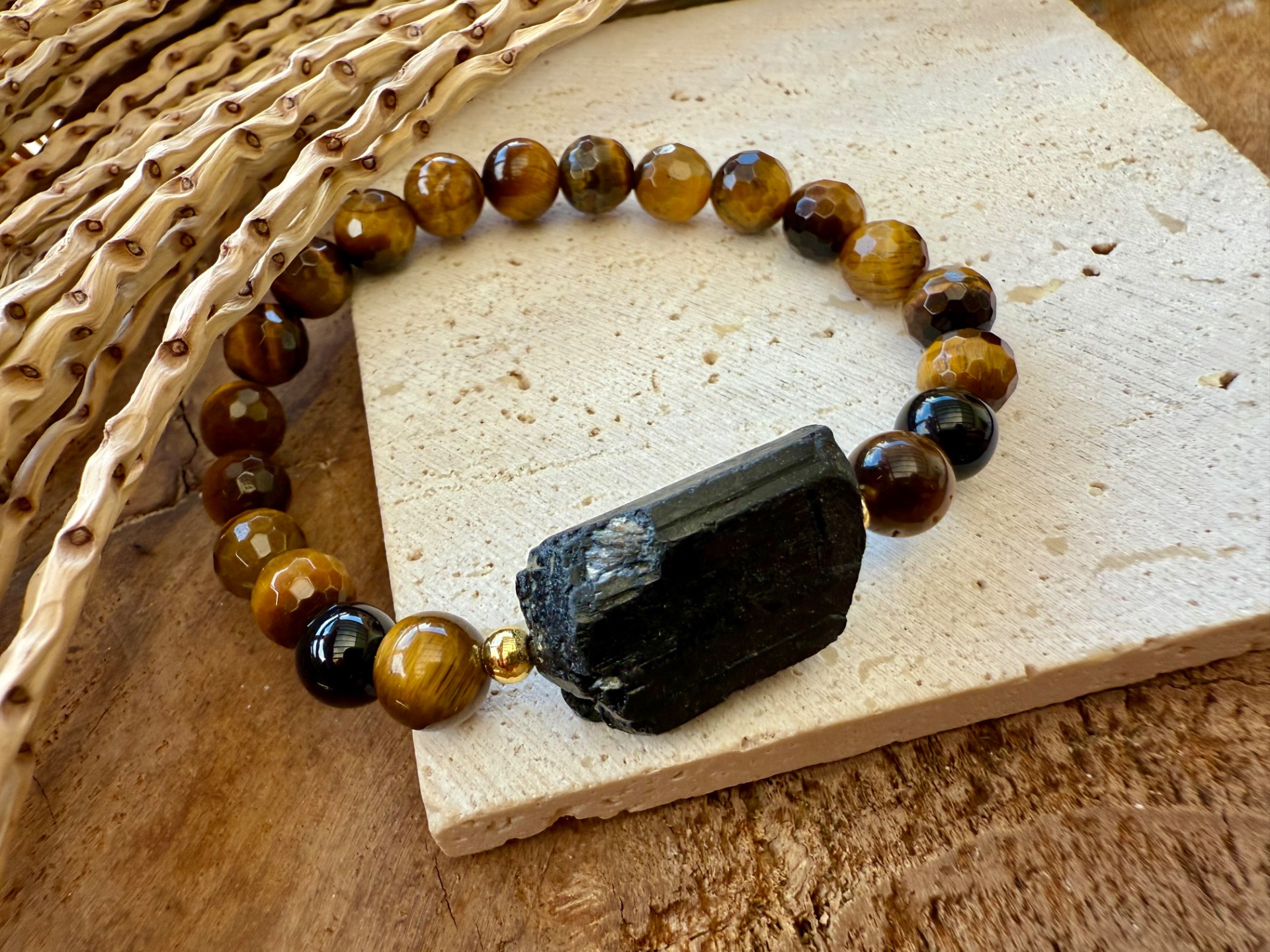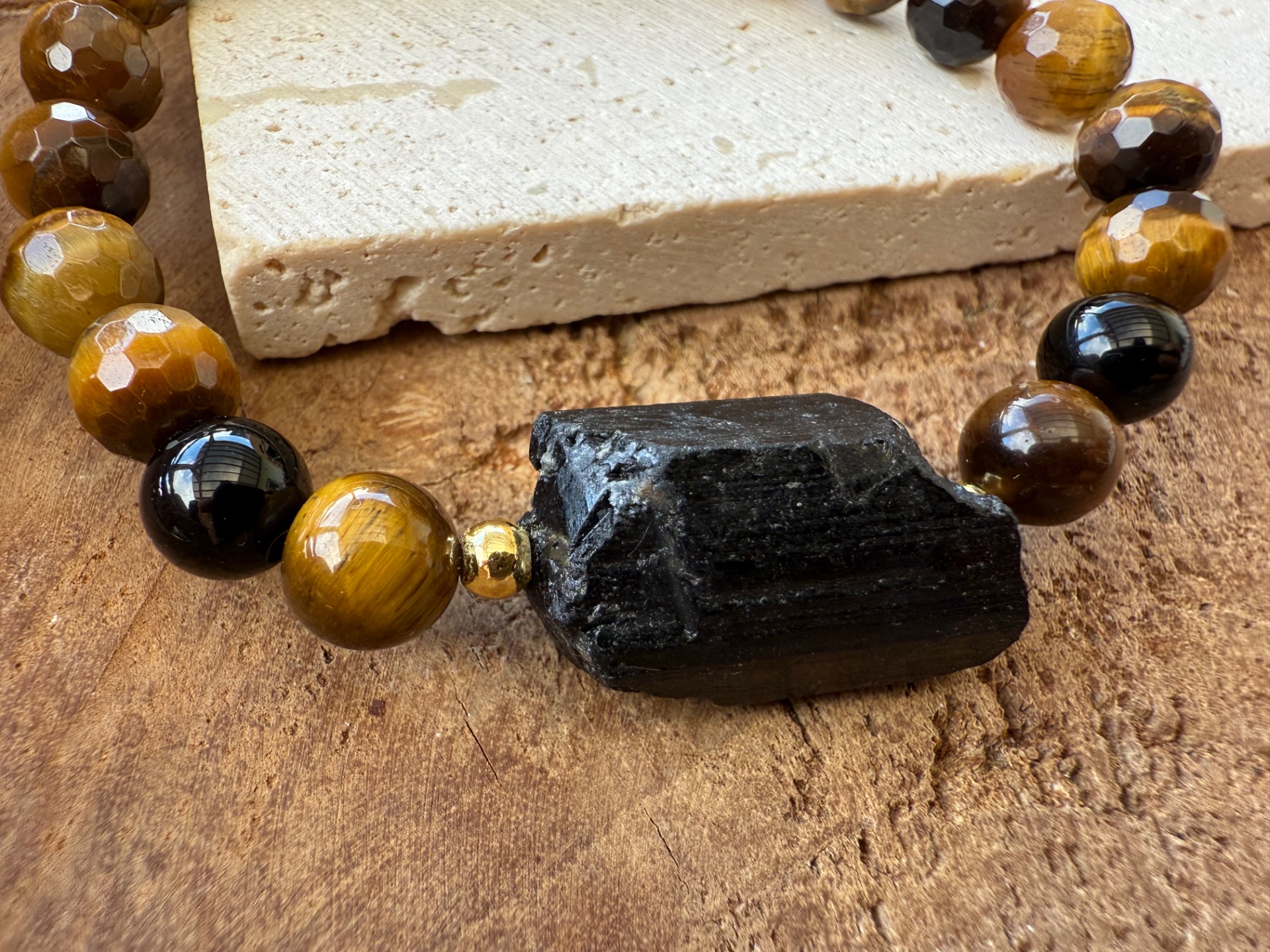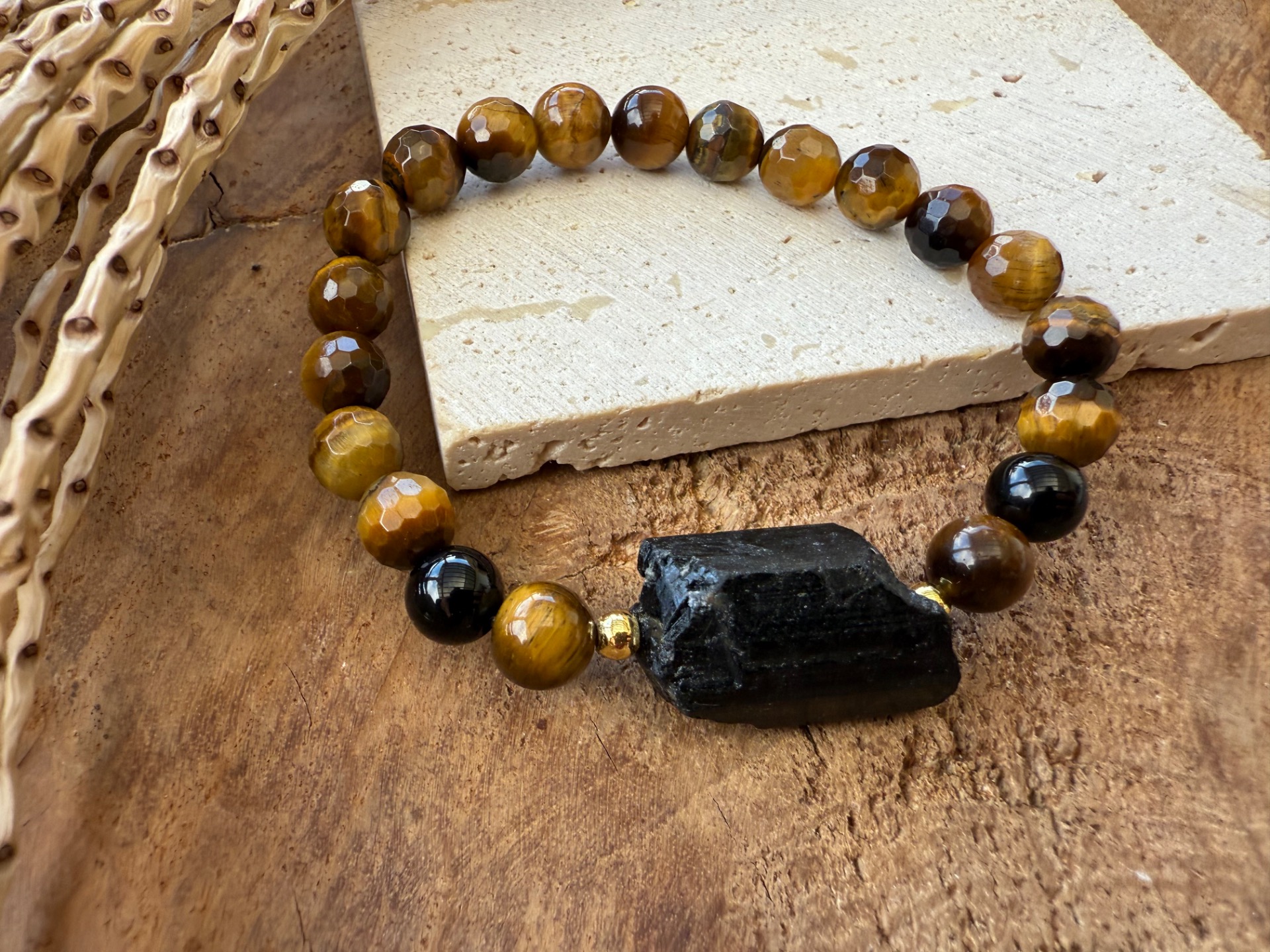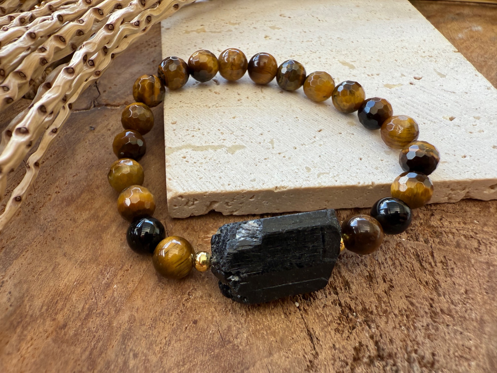 Náramok z minerálov tigrie oko 8mm, hladký +fazet výbrus + turmalín čierny surový 3cm.