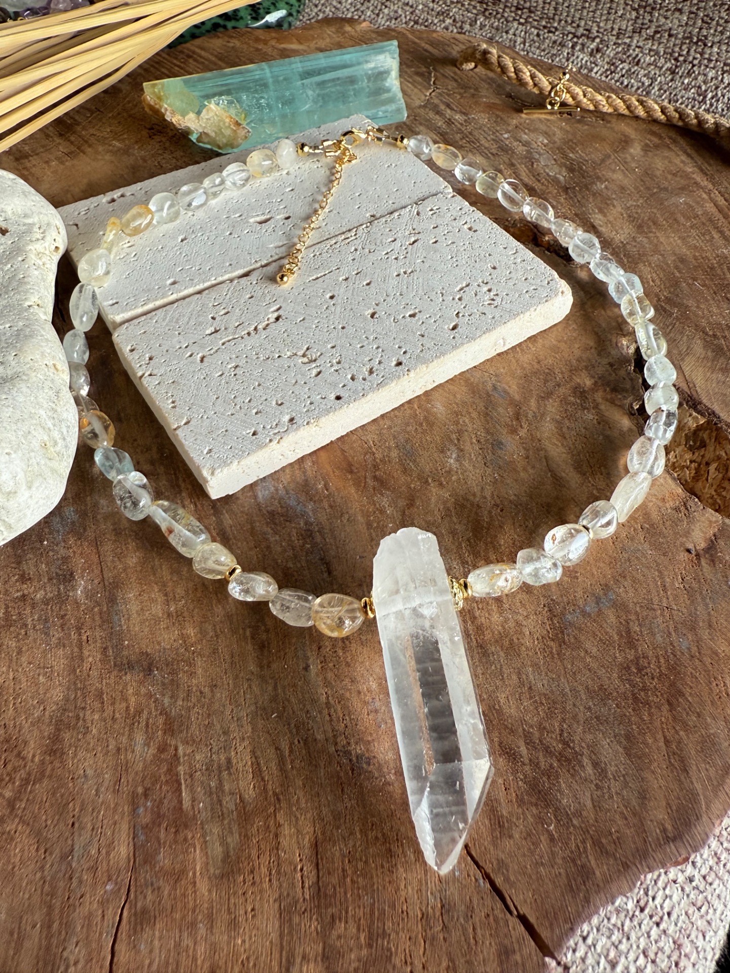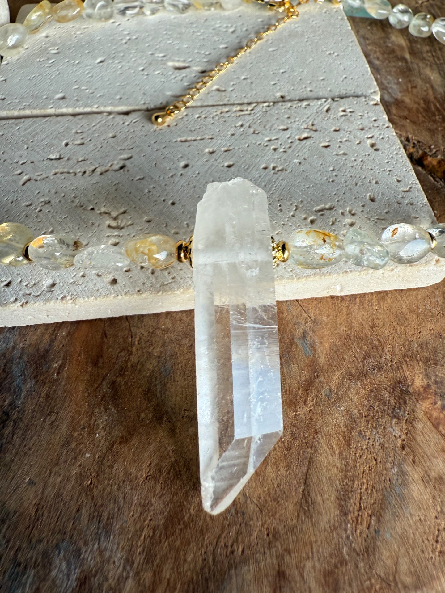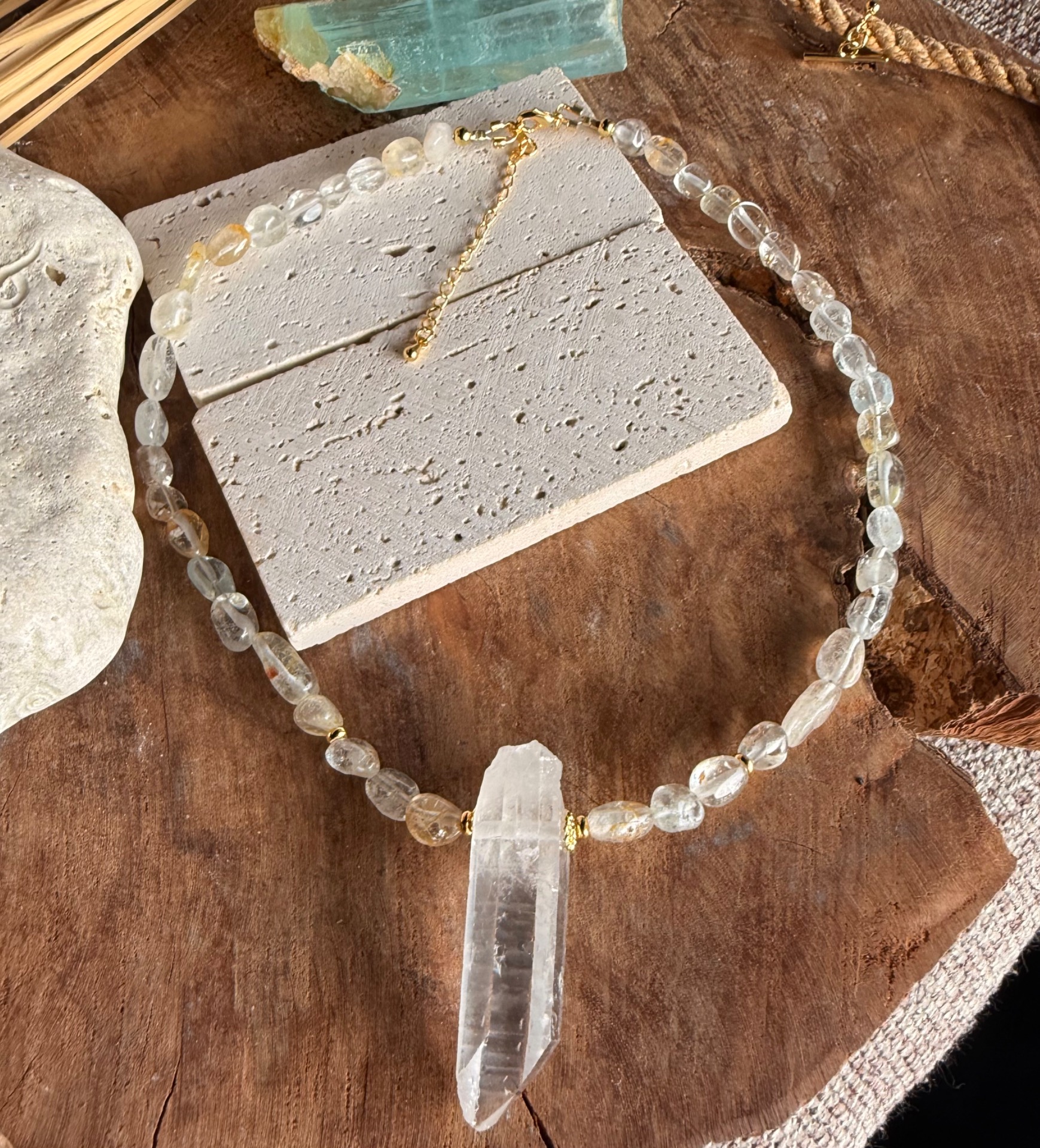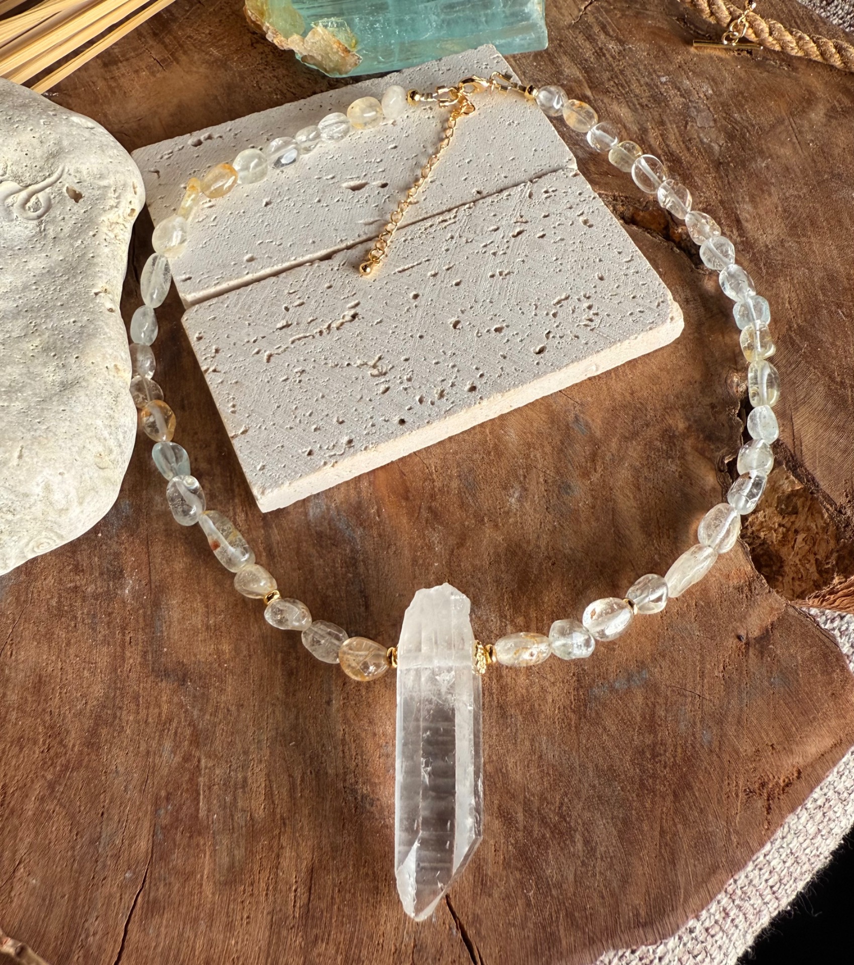Náhrdelník je tvorený nepravidelnými nuggetmi topazu s jemnou, príjemne pulzujúcou energiou. Dominantou je centrálny surový horský krištáľ, vrtaný cez stred, ktorý si zachováva svoju prirodzenú štruktúru a čistotu.
