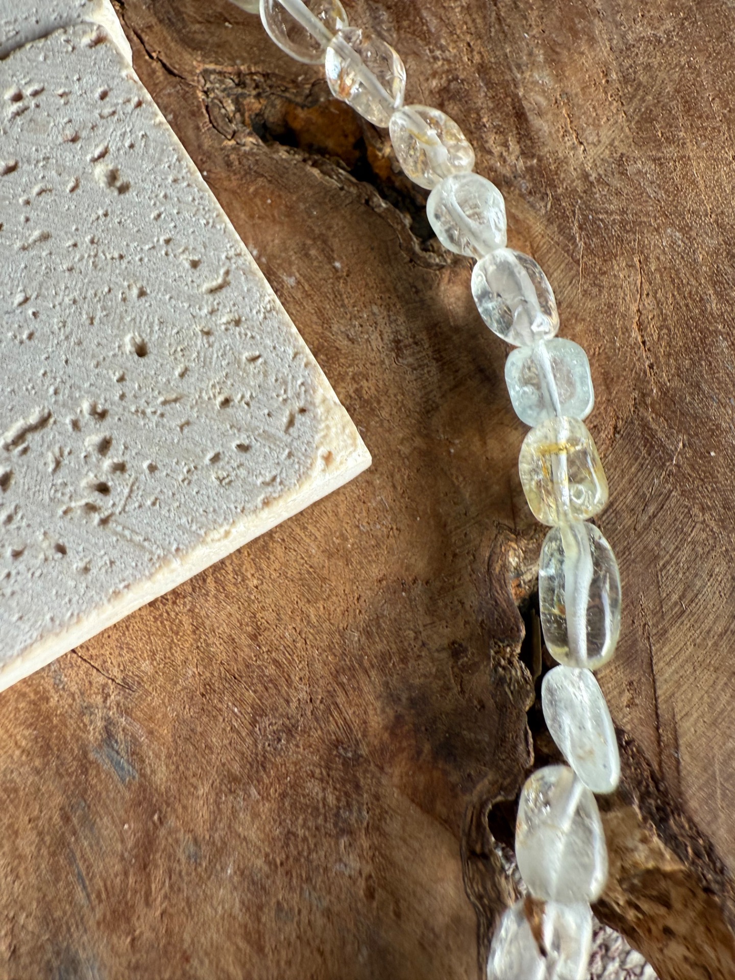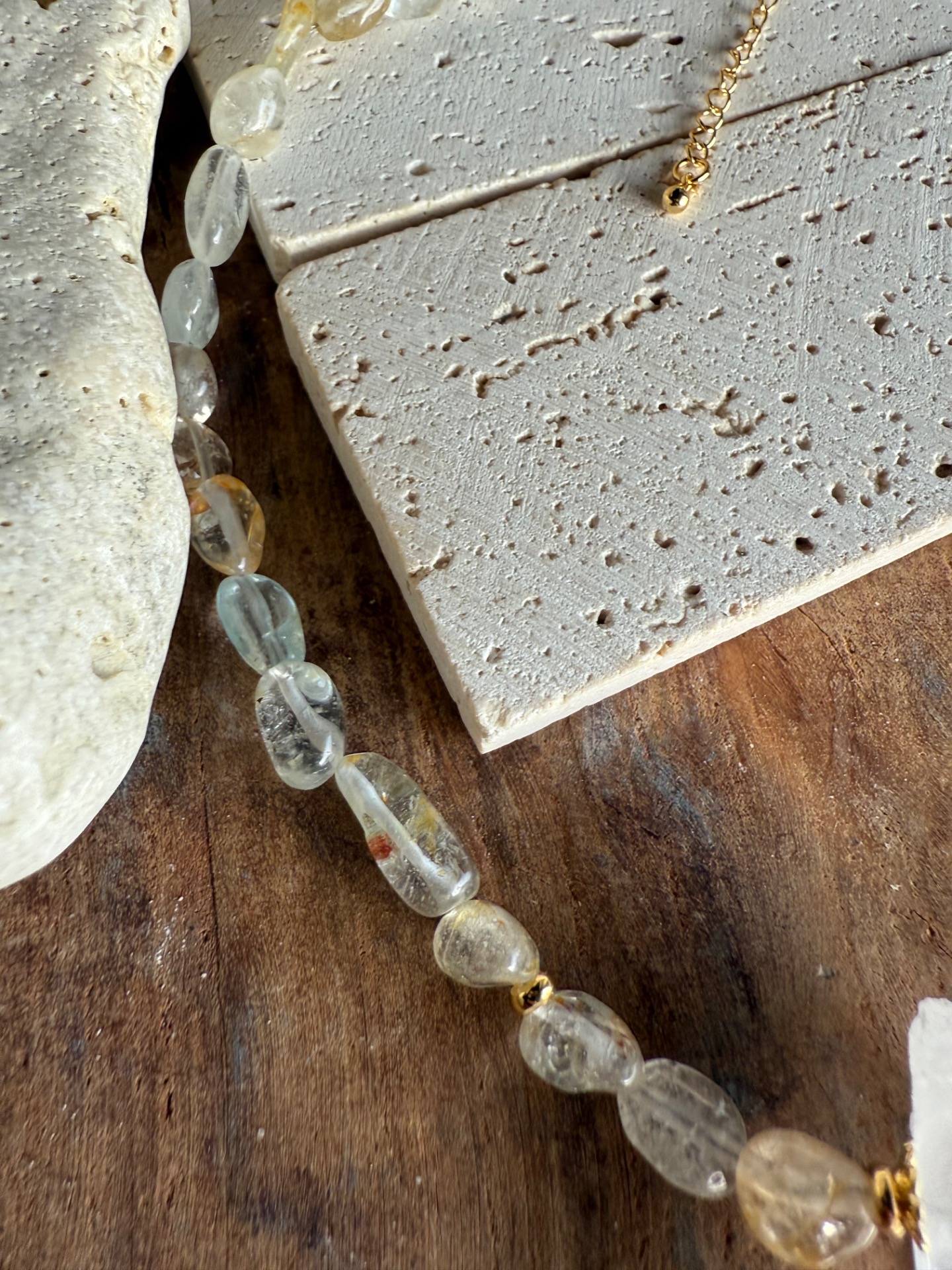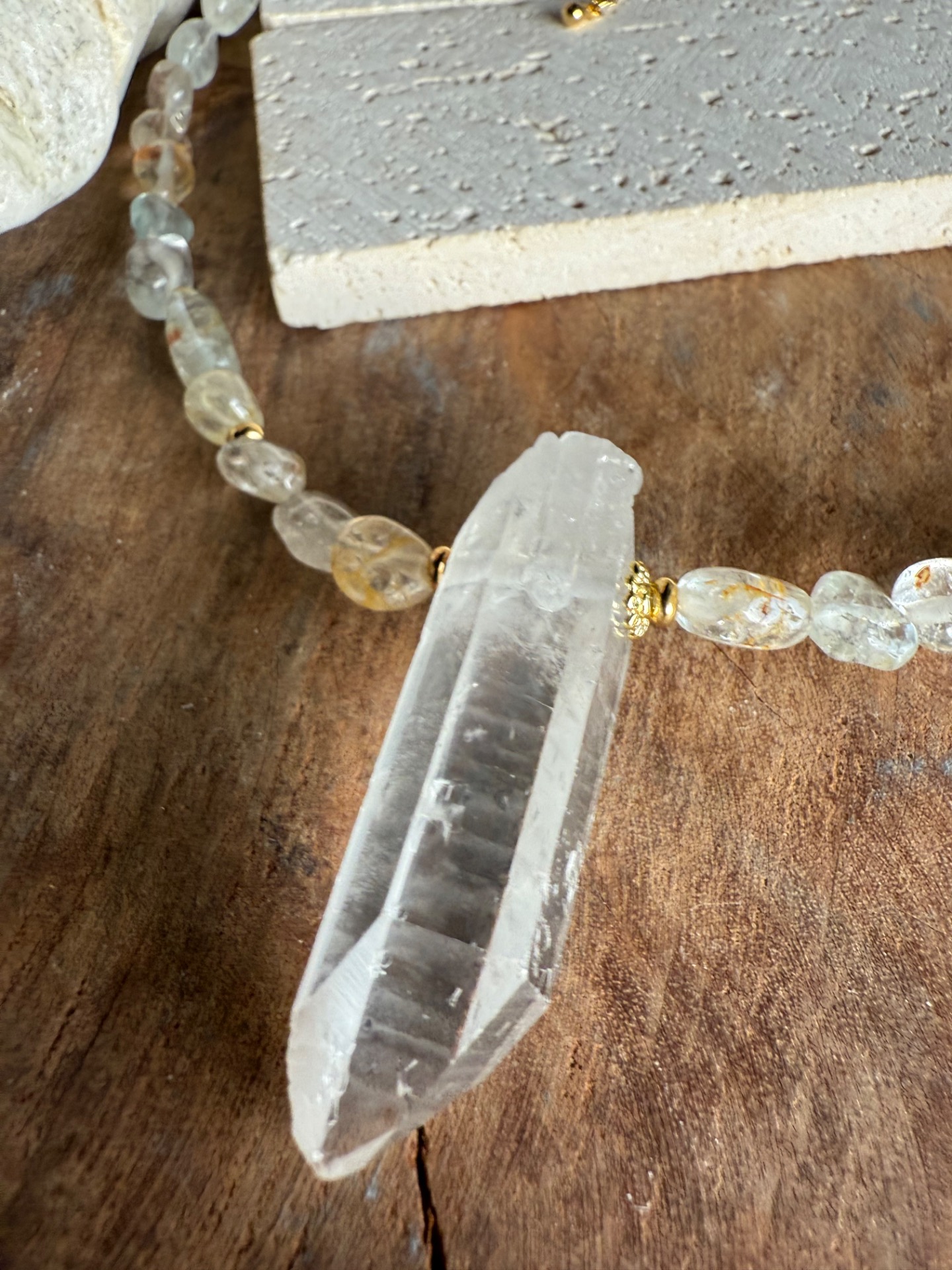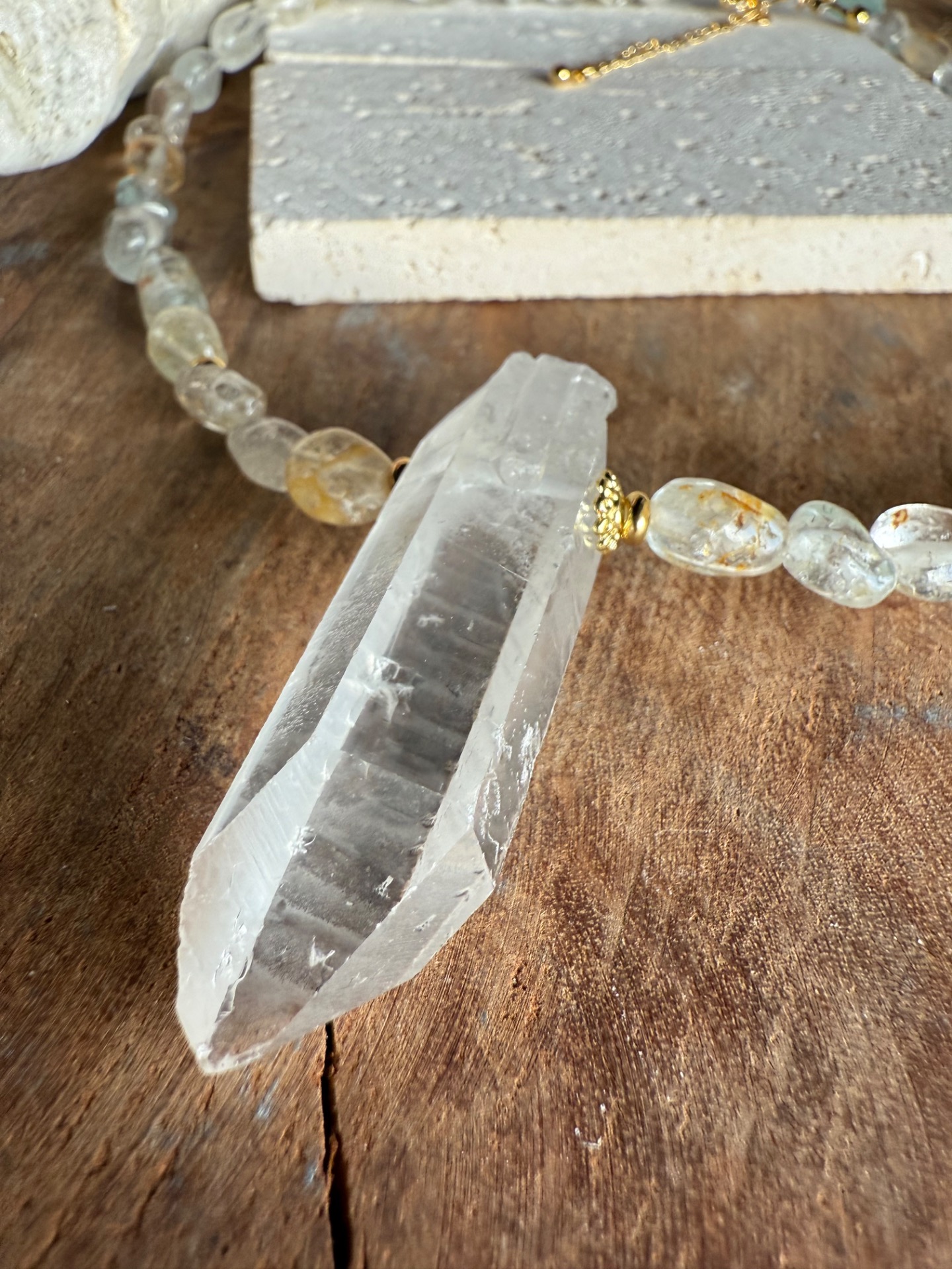 Náhrdelník je tvorený nepravidelnými nuggetmi topazu s jemnou, príjemne pulzujúcou energiou. Dominantou je centrálny surový horský krištáľ, vrtaný cez stred, ktorý si zachováva svoju prirodzenú štruktúru a čistotu.