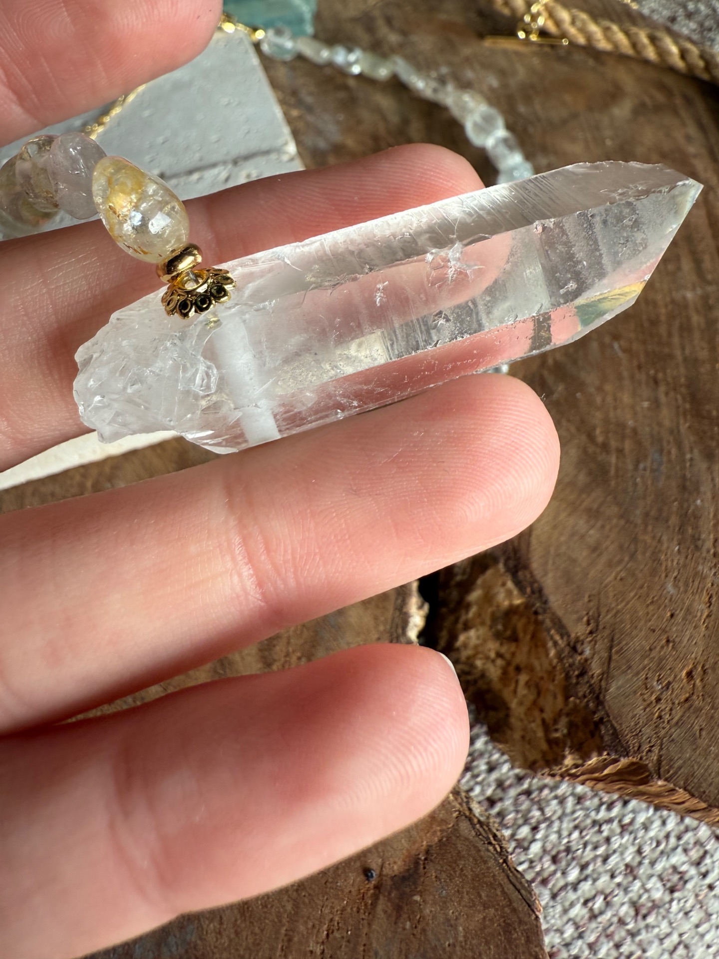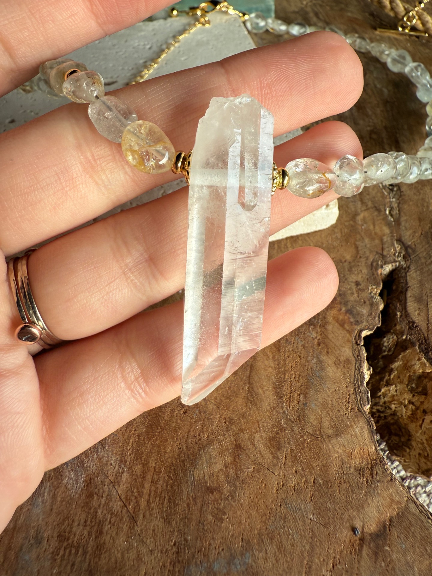 Spojenie topazu a horského krištáľu vytvára harmonický celok, ktorý rozjasňuje vnútorný svet a zároveň zosilňuje energiu nositeľky. Surový krištáľ v strede pôsobí ako čistý zdroj svetla – prirodzený, silný a autentický.