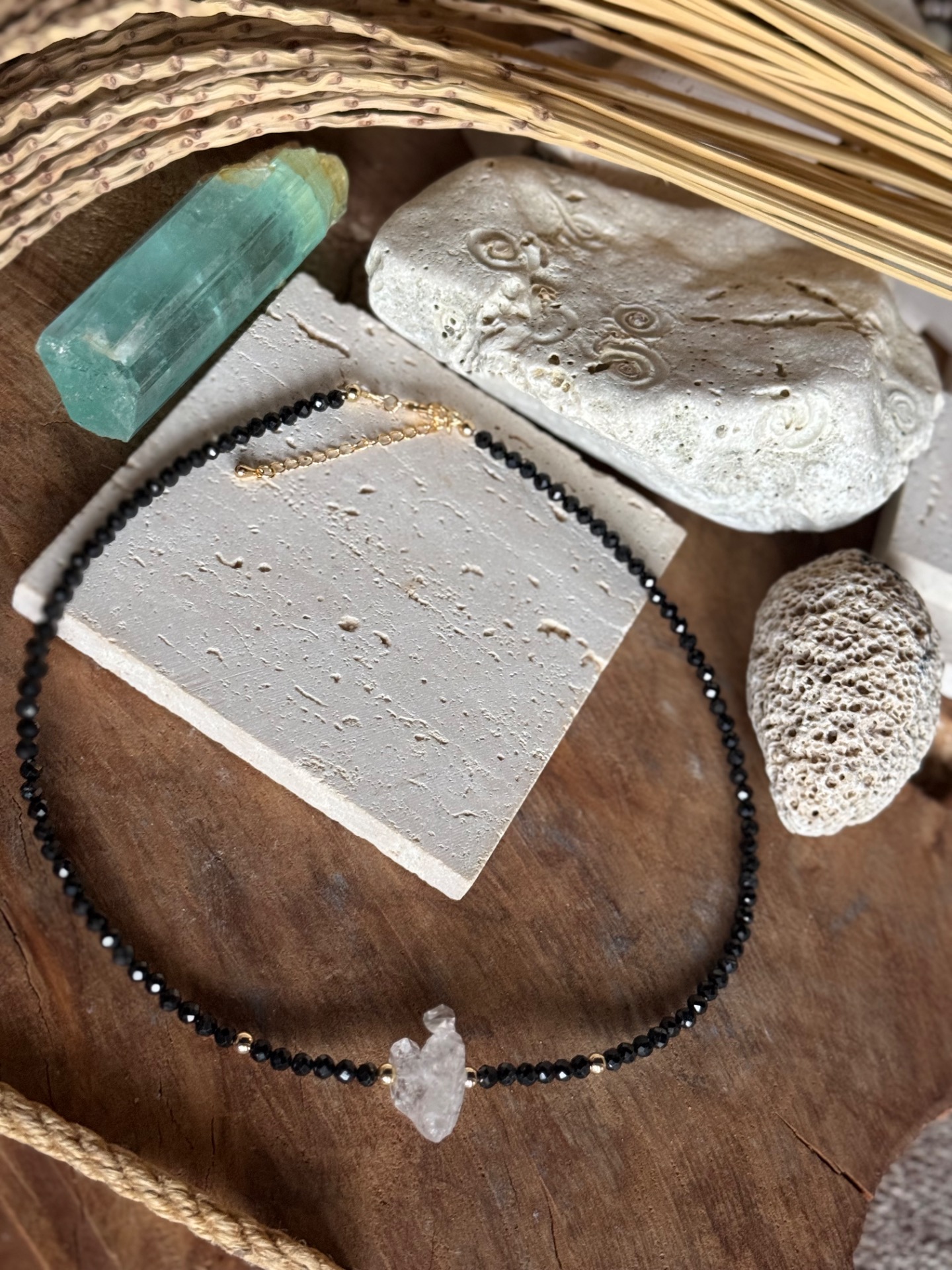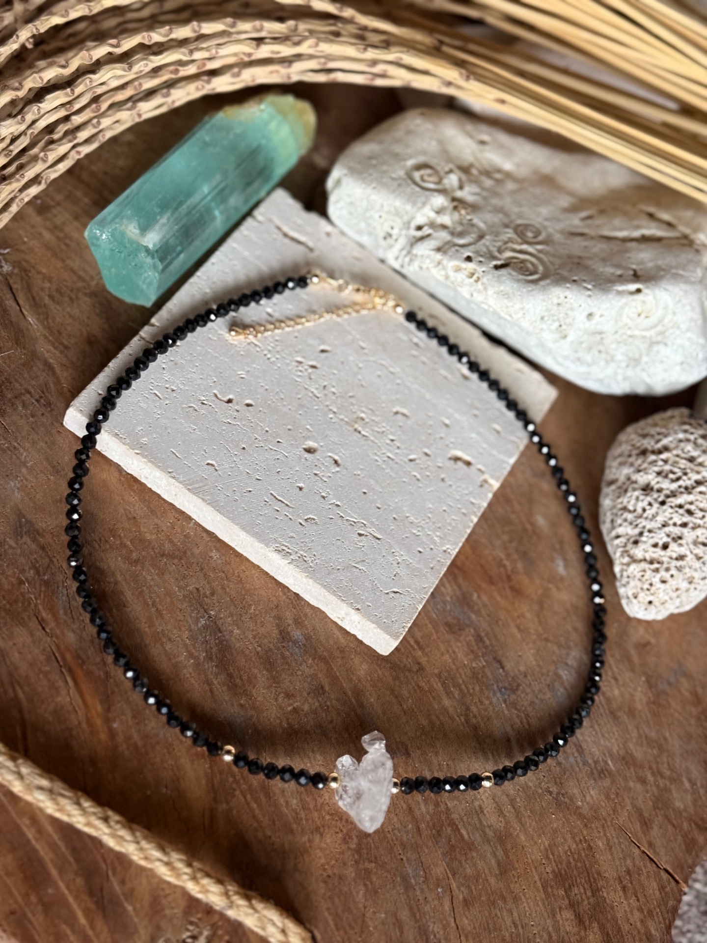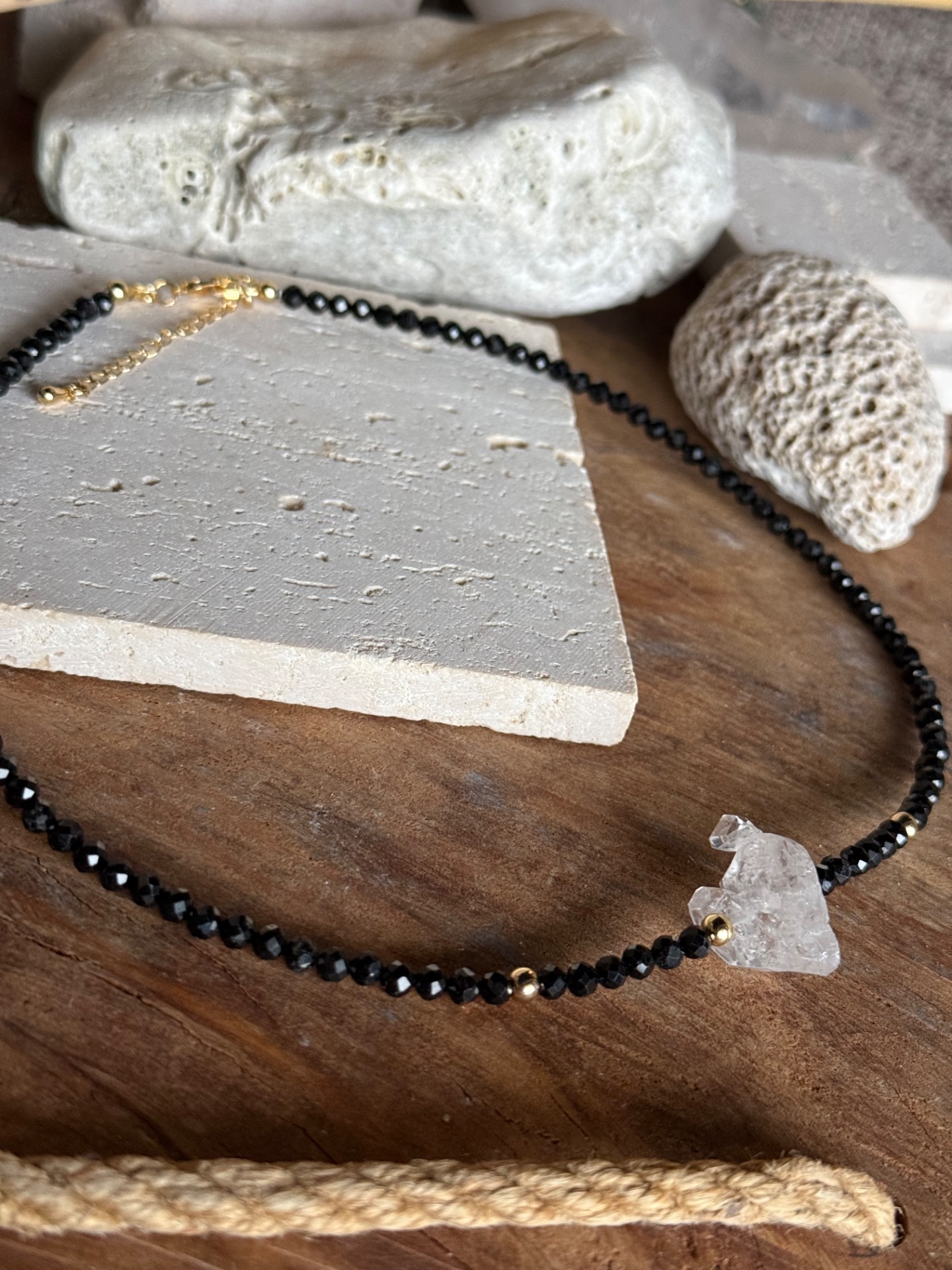 Prebuď silu ochrany a energetickej rovnováhy s týmto luxusným choker náhrdelníkom, ktorý kombinuje čierny spinel a unikátny Herkimer trojhrot. Tento klenot nie je len šperk – je to energetický štít, ktorý chráni teba aj tvoju rodinu, zatiaľ čo zdôrazňuje elegantný a jemný štýl.