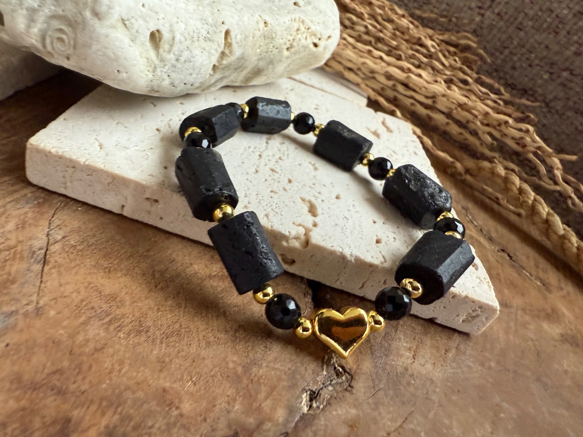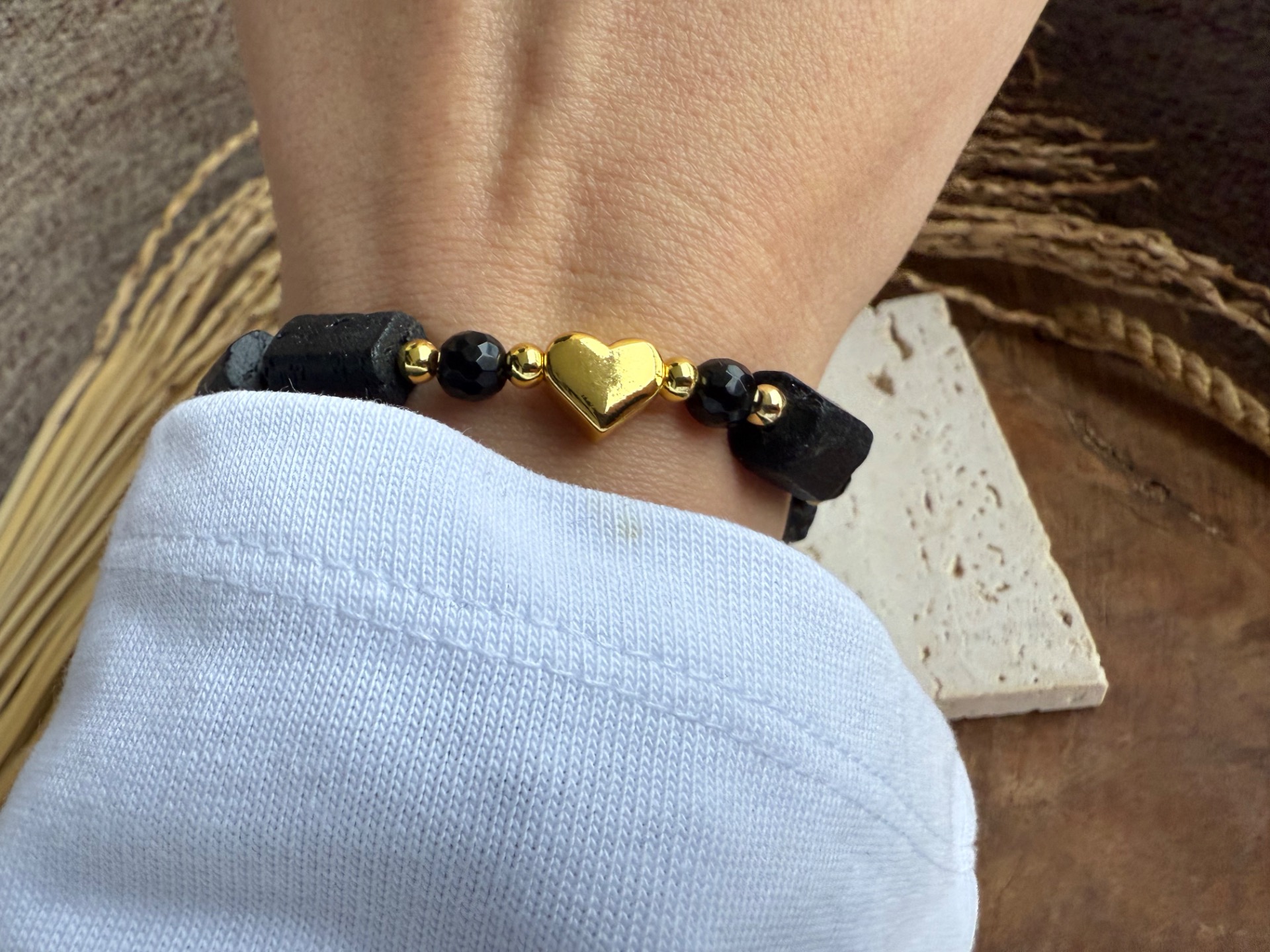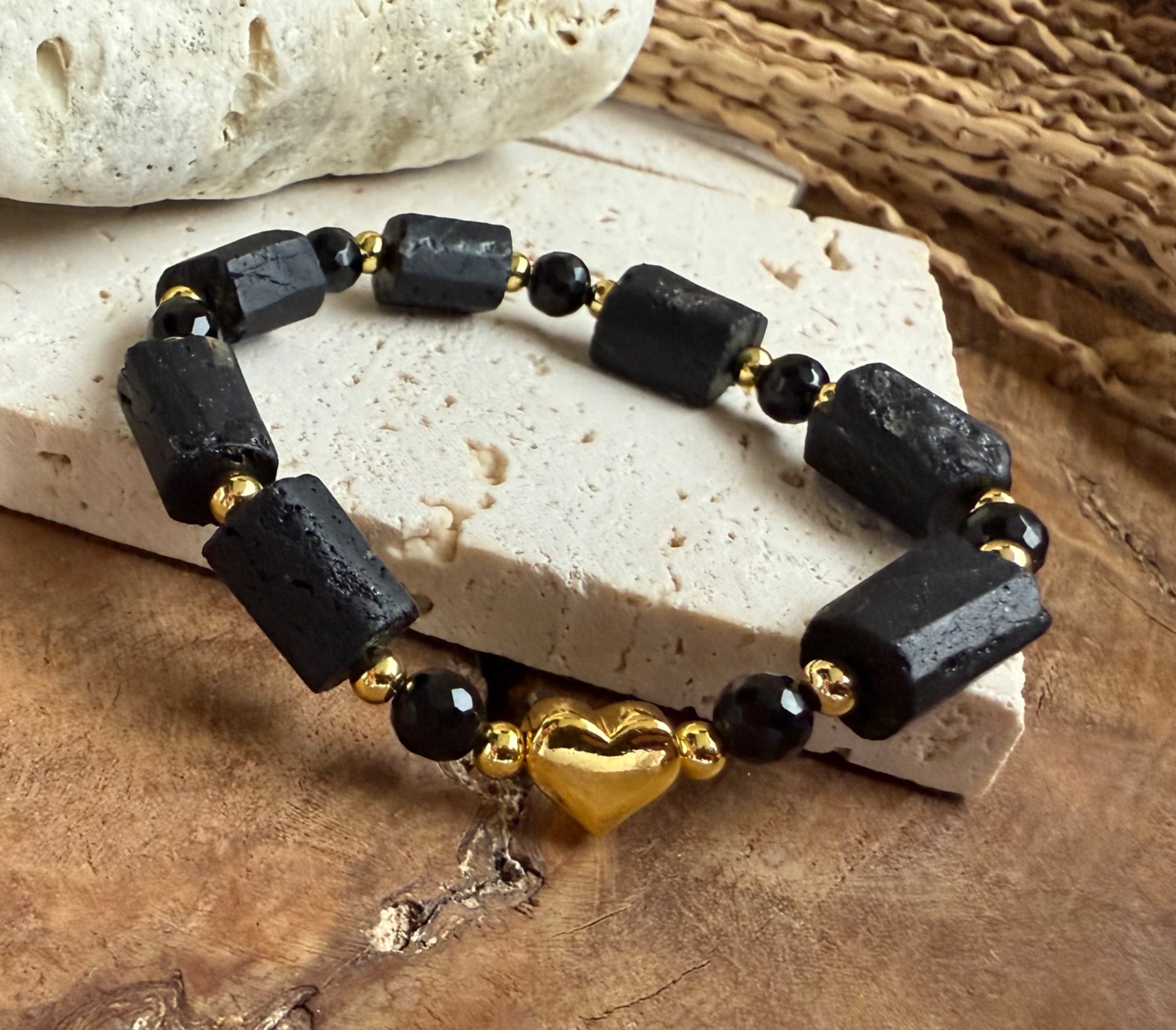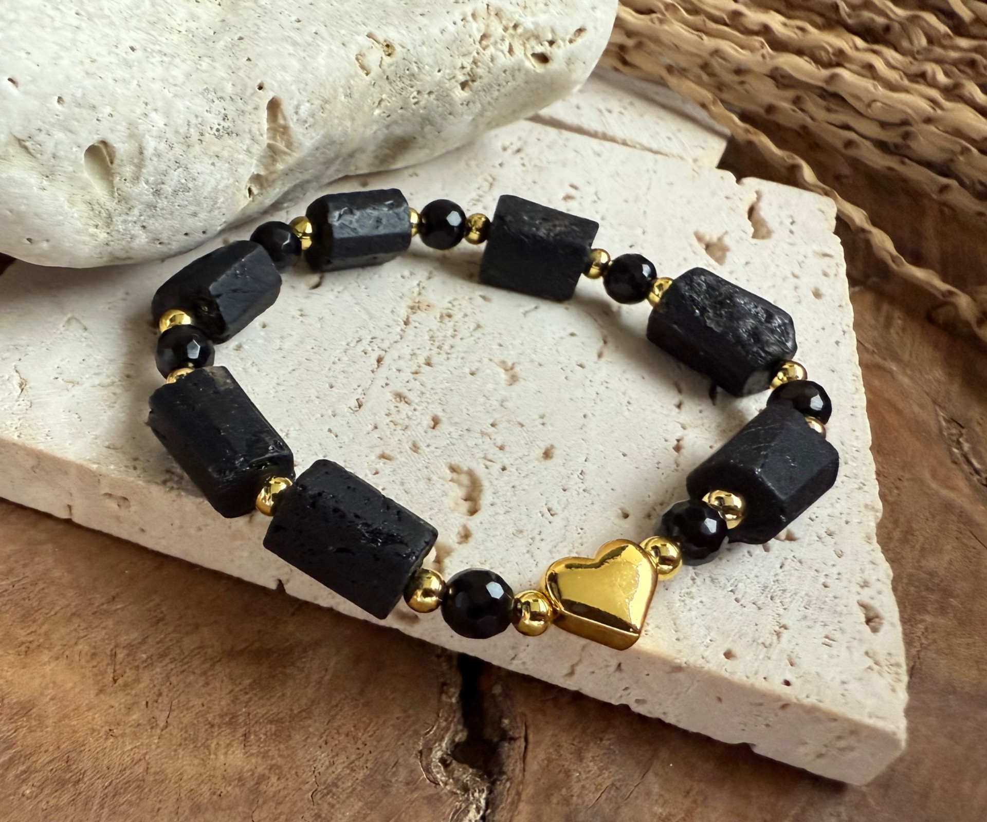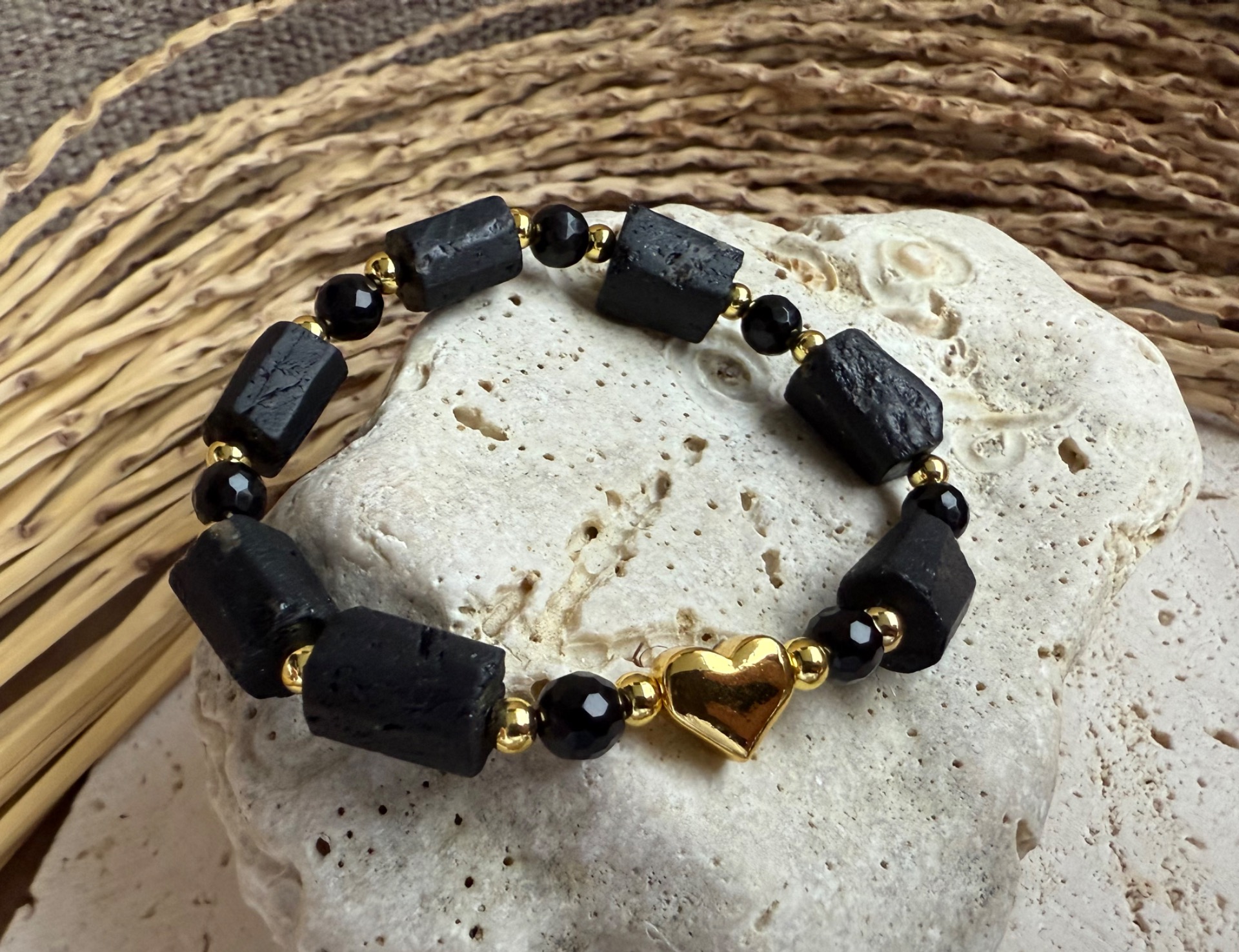 Ochranný štít – náramok z turmalínu a obsidiánu so srdcom (14k gold plated)