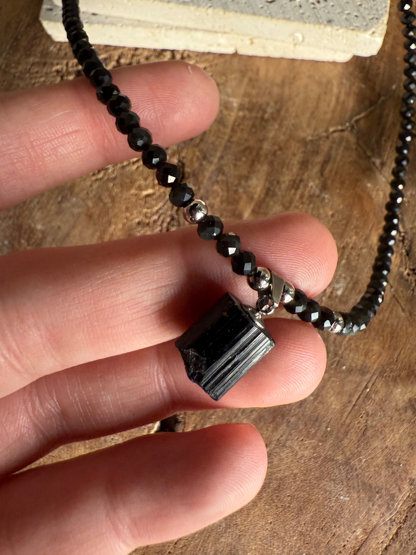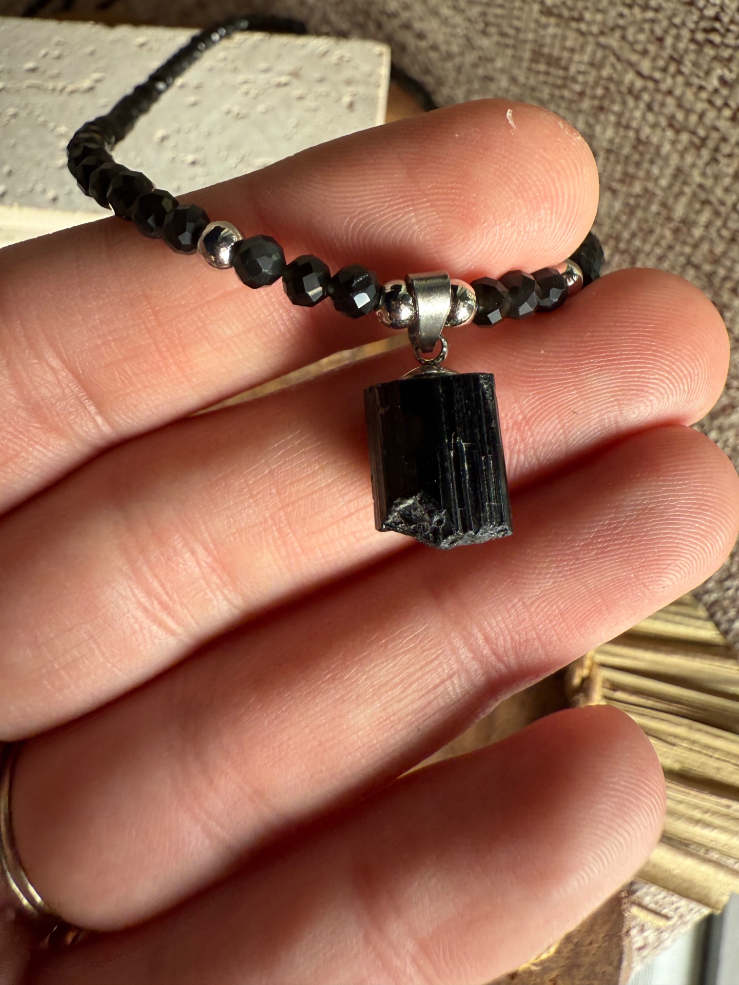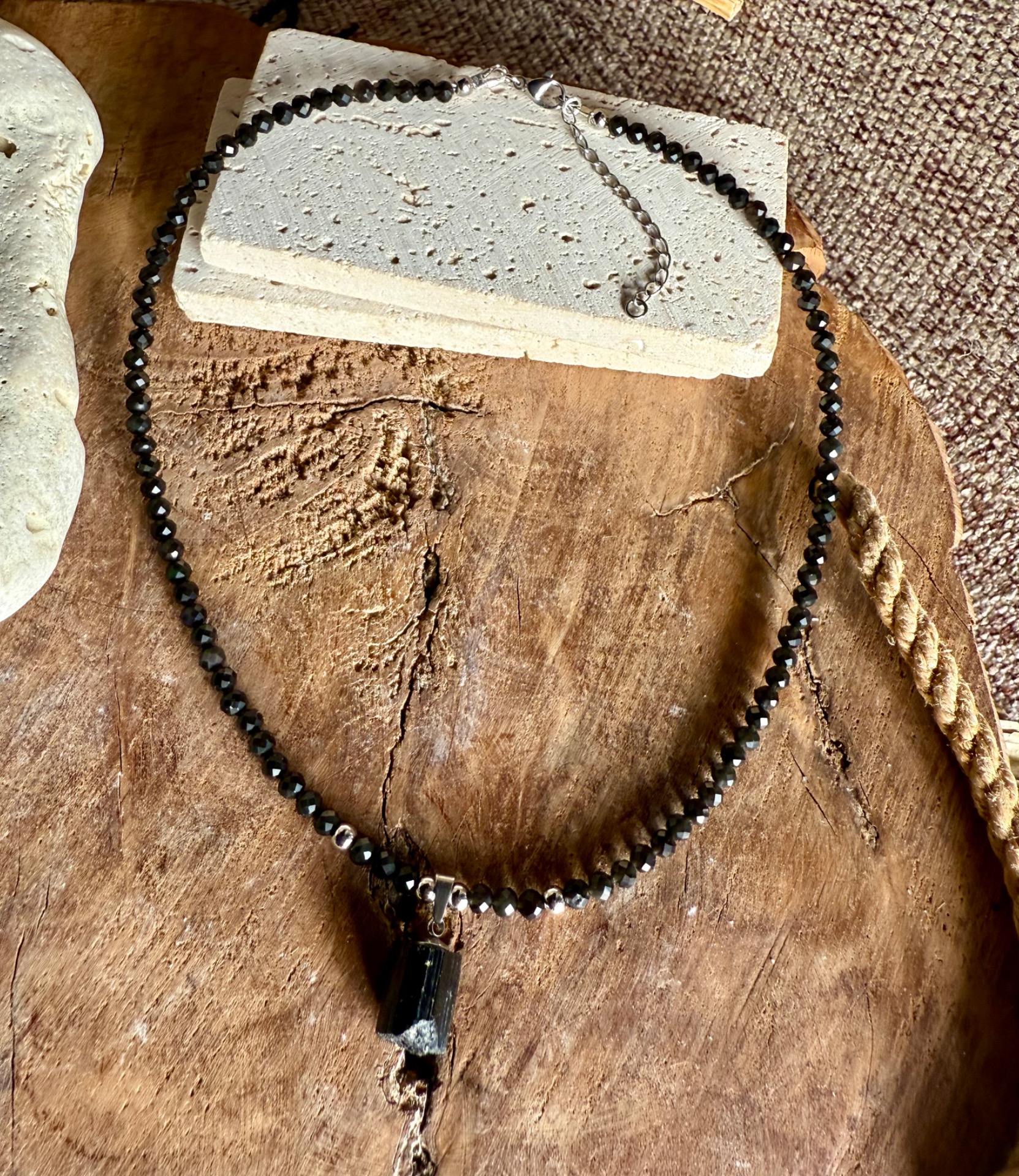 Mini prívesok z čierneho turmalínu pôsobí ako tichý ochranný symbol, ktorý ťa sprevádza počas dňa.