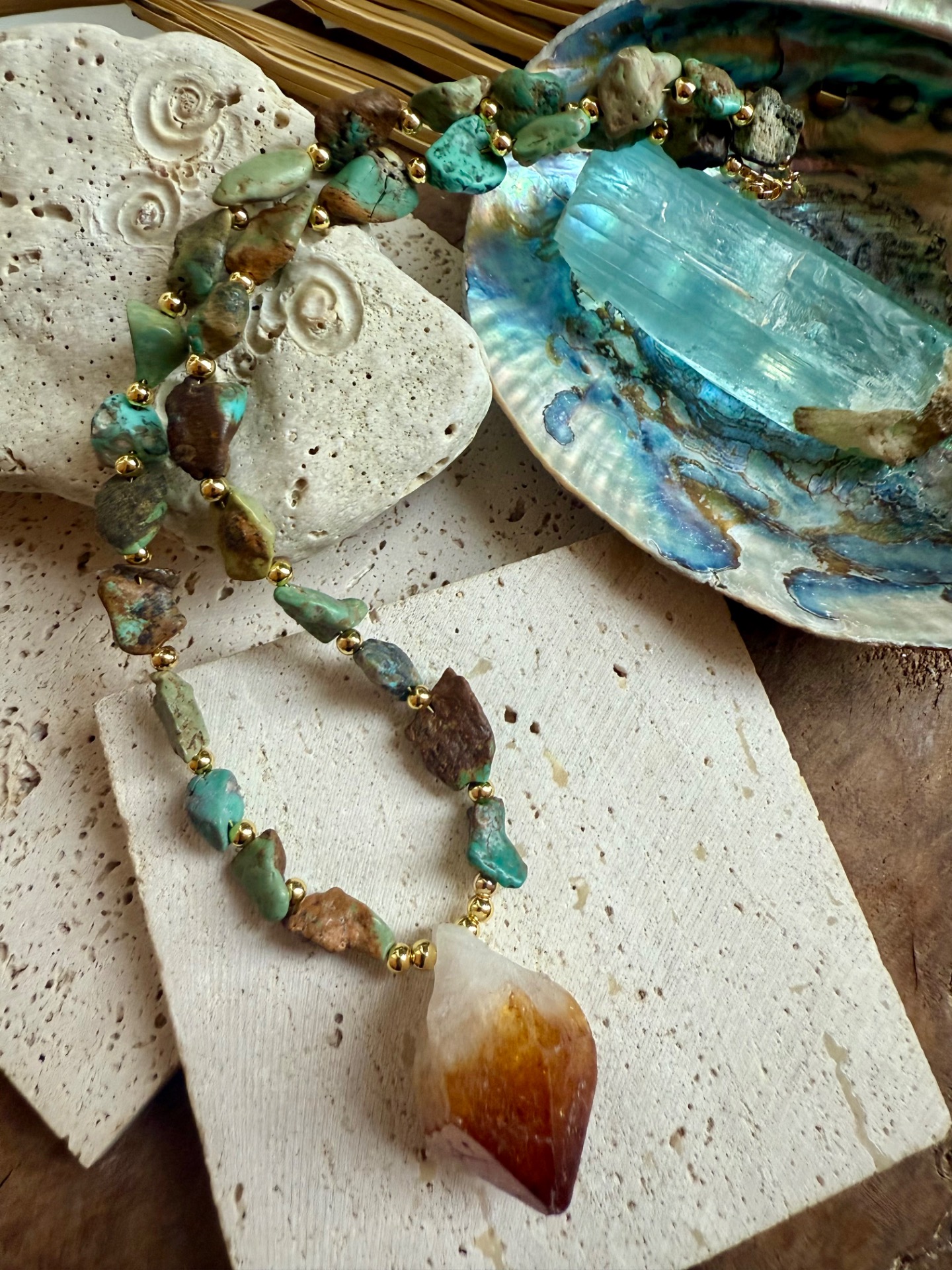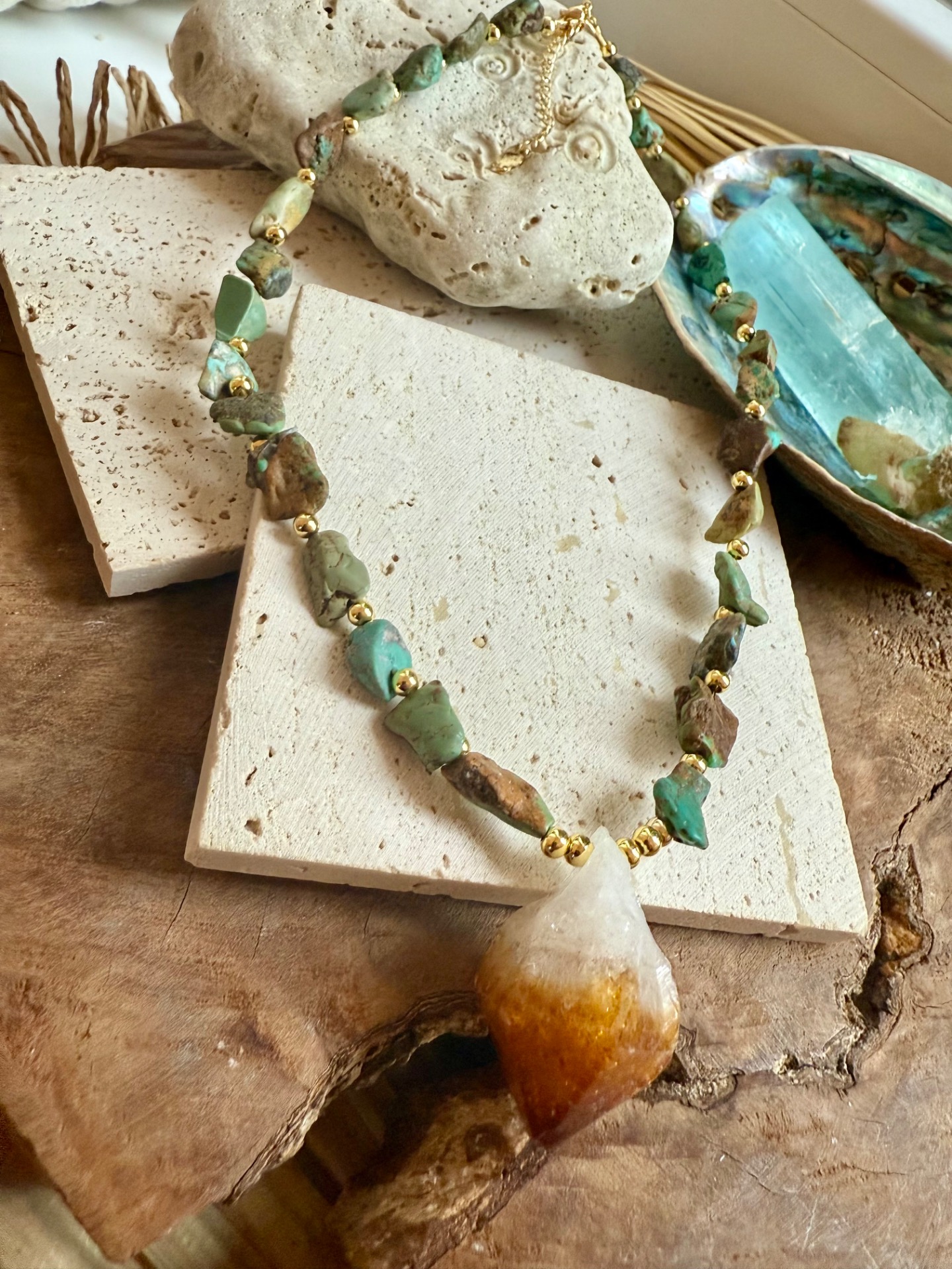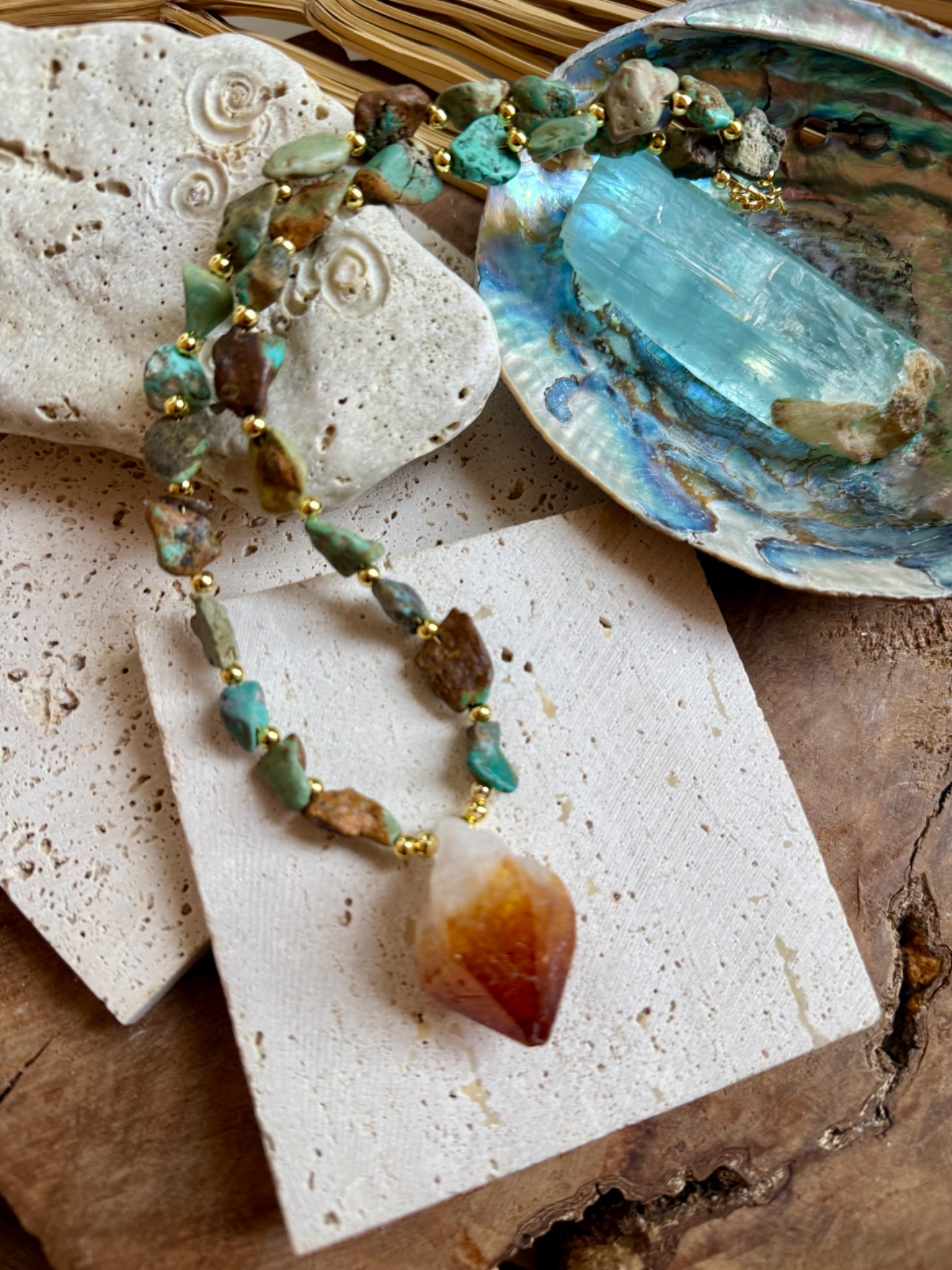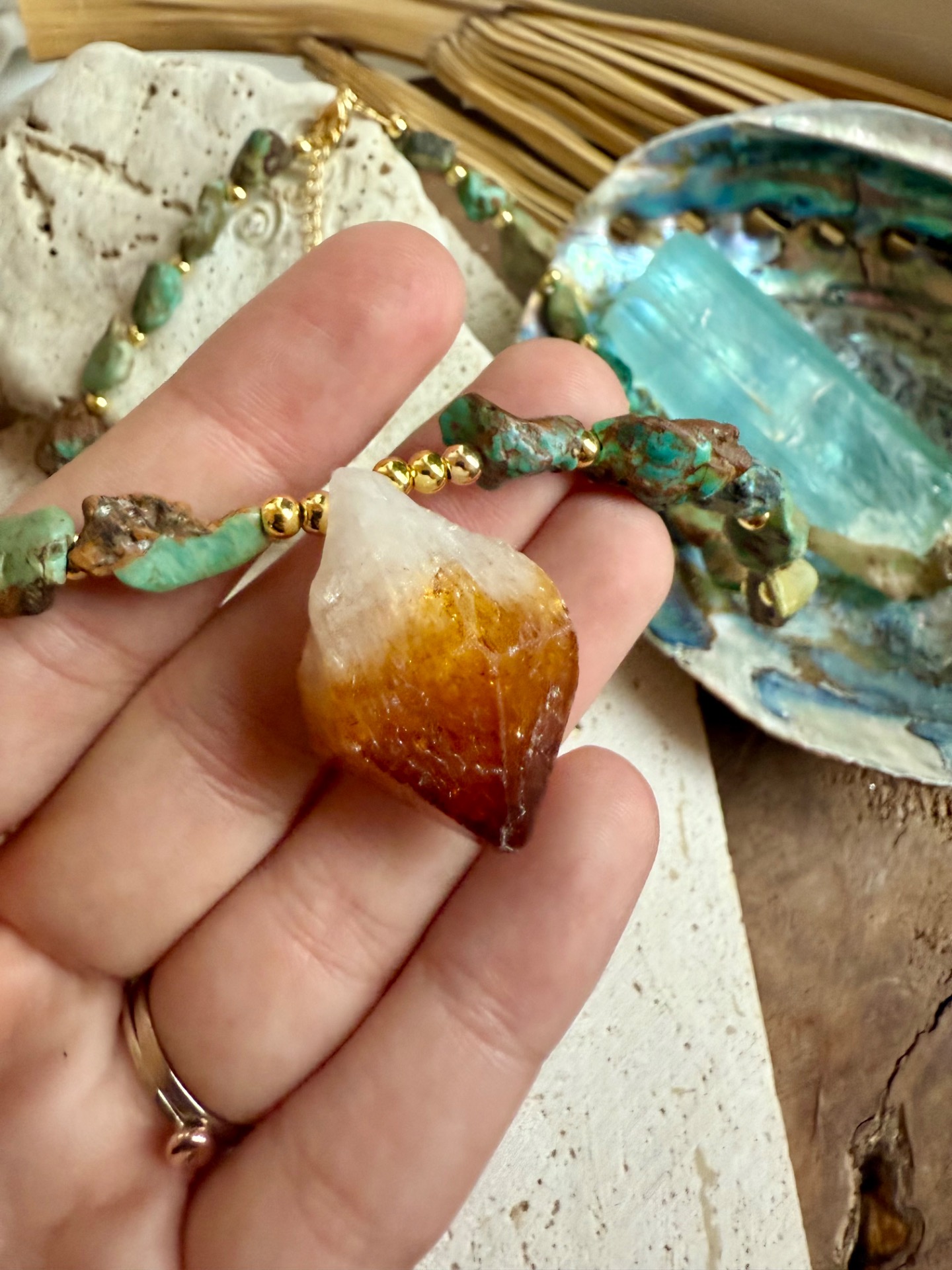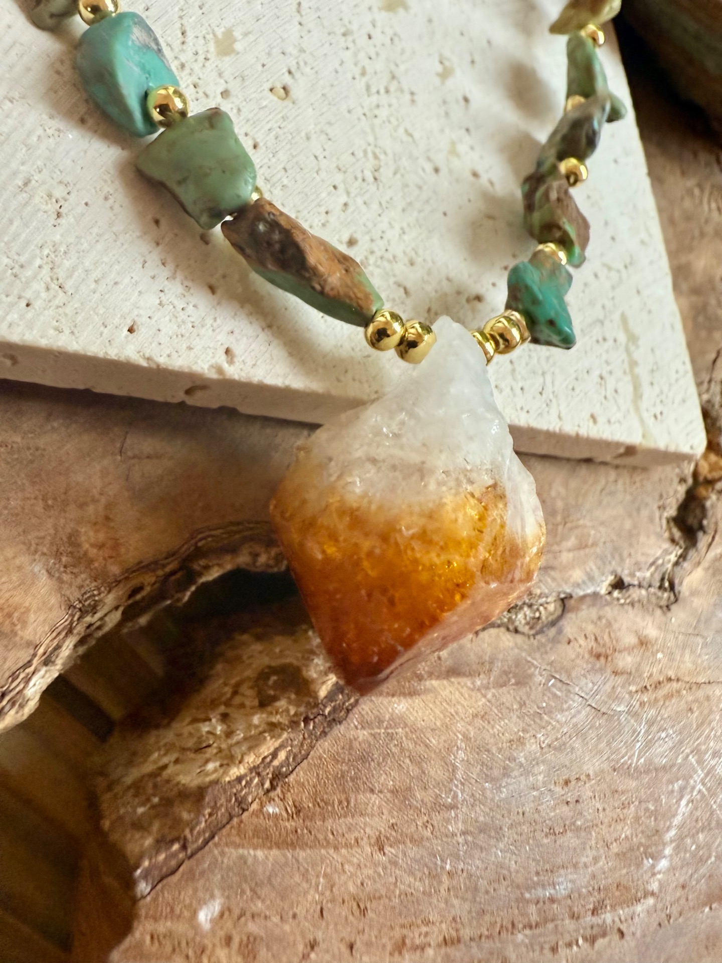 Krátky náhrdelník zo surového tyrkysu hubei+citrín surový- liečiteľka