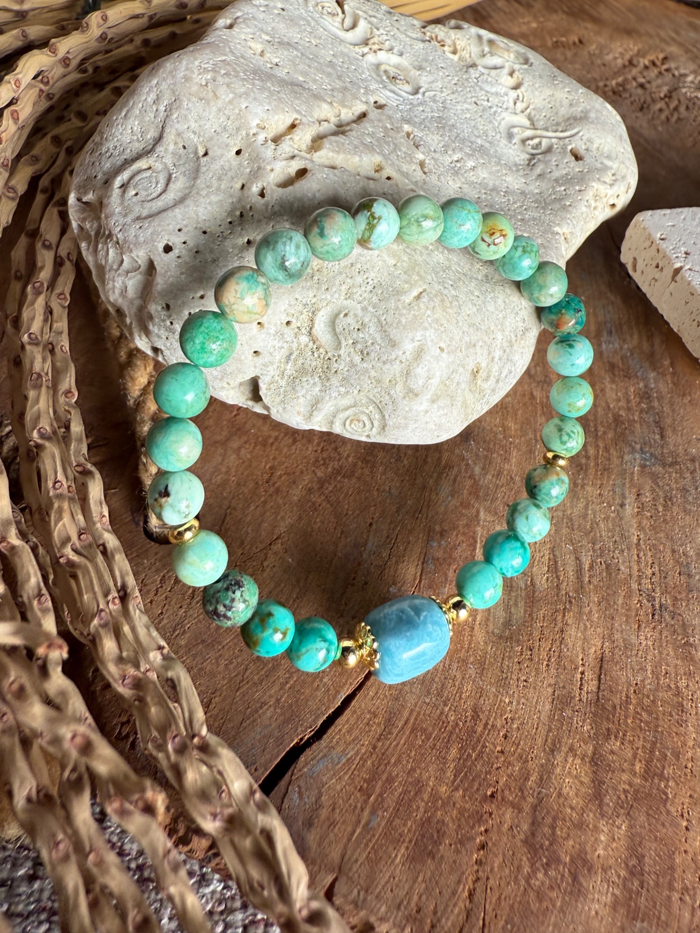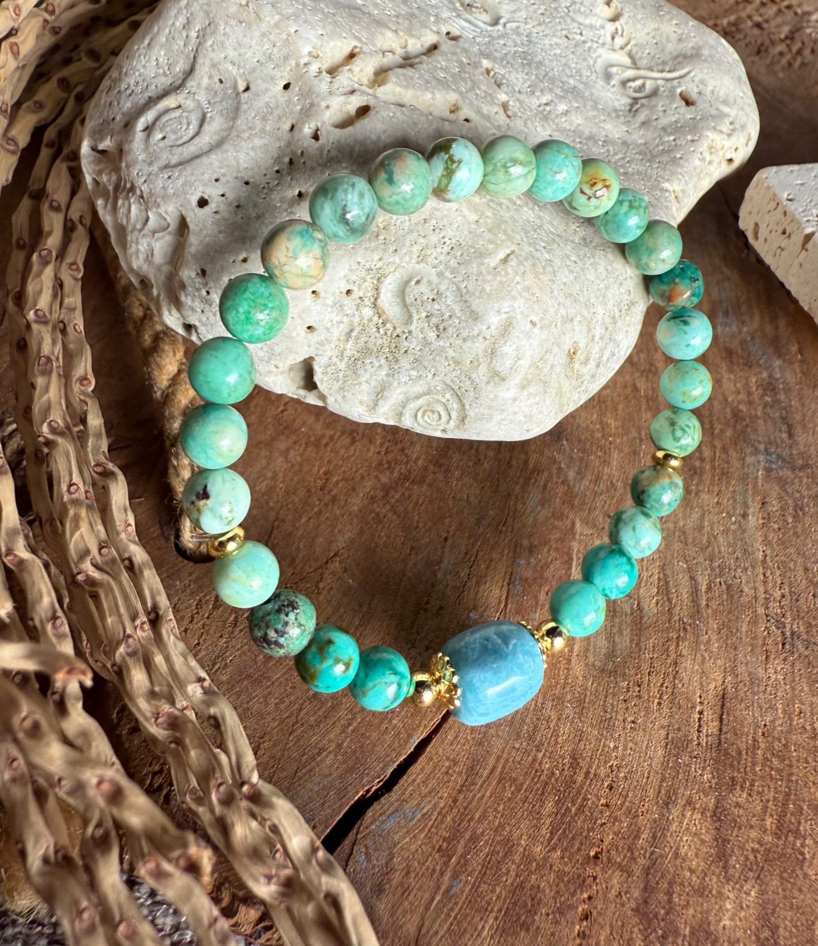Náramok je tvorený 6mm nuggetmi tyrkysu z Peru a hemimorfitom, ktoré spoločne podporujú vyjadrenie seba samého a sebavedomú komunikáciu. Šperk je navrhnutý tak, aby bol elegantný a pohodlný na každodenné nosenie.