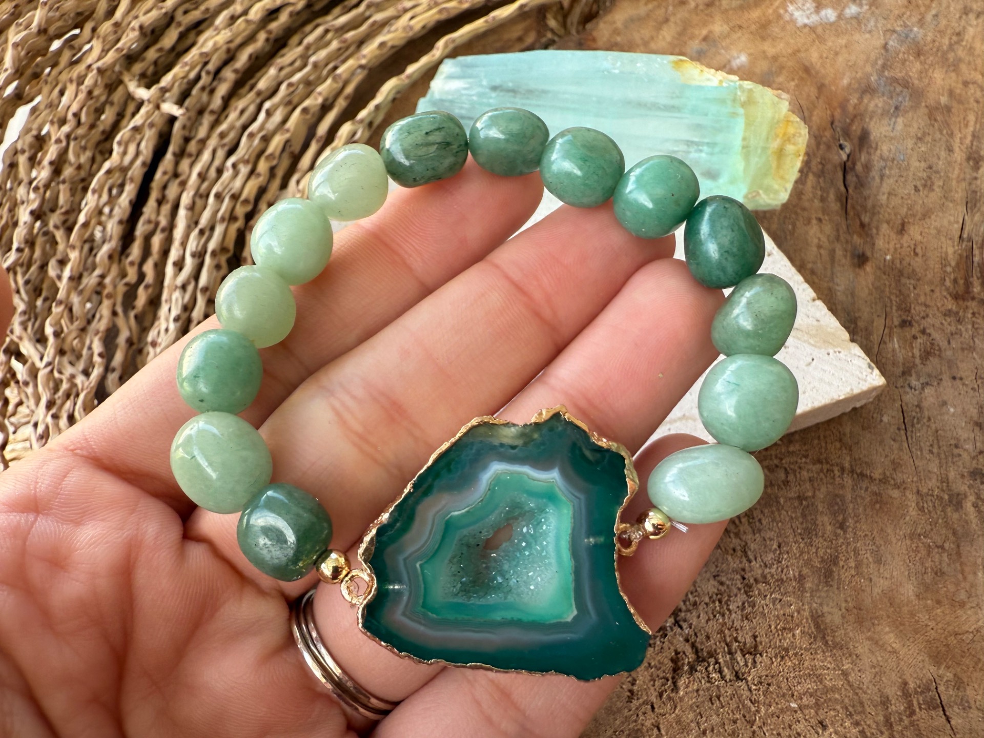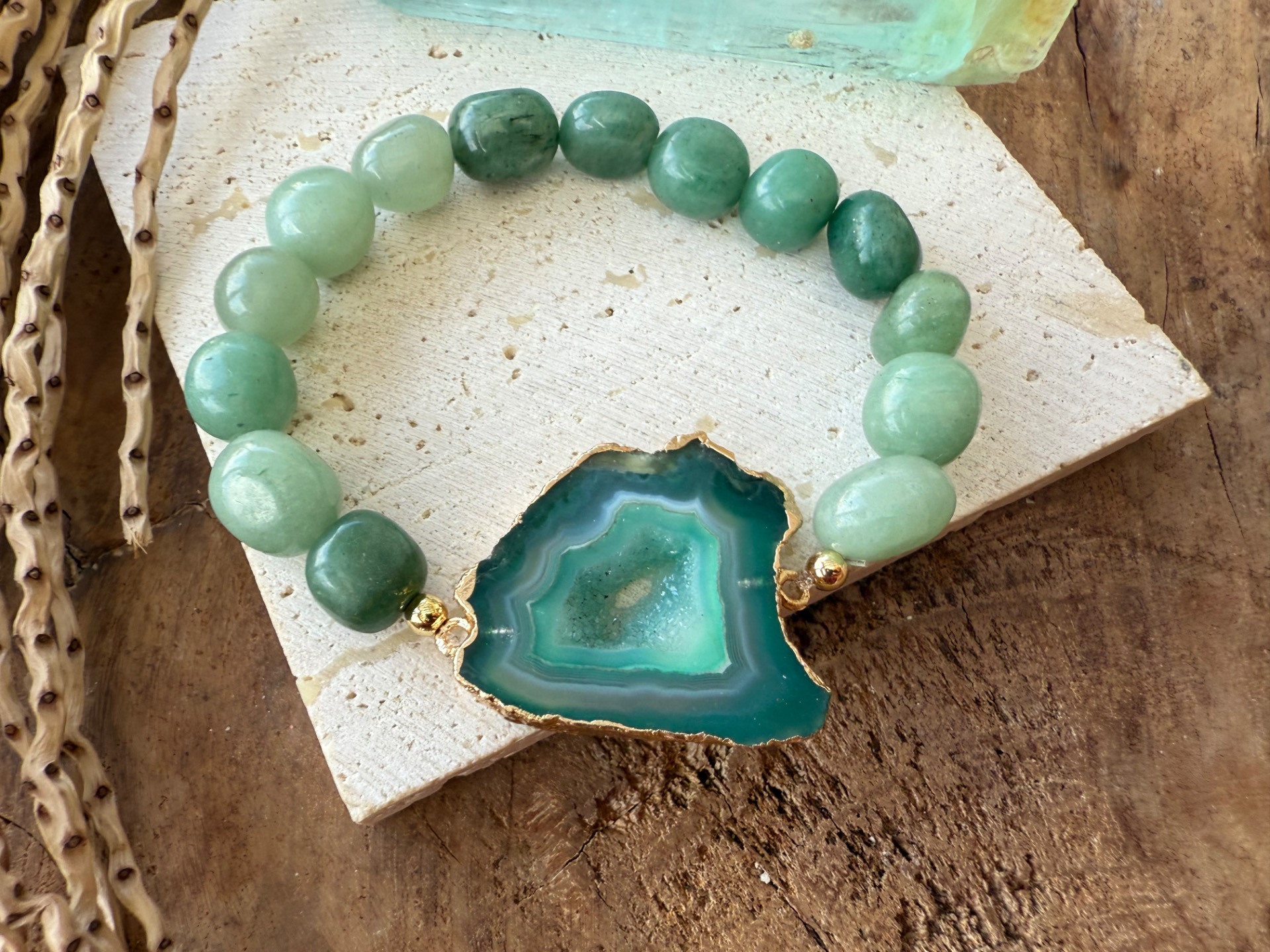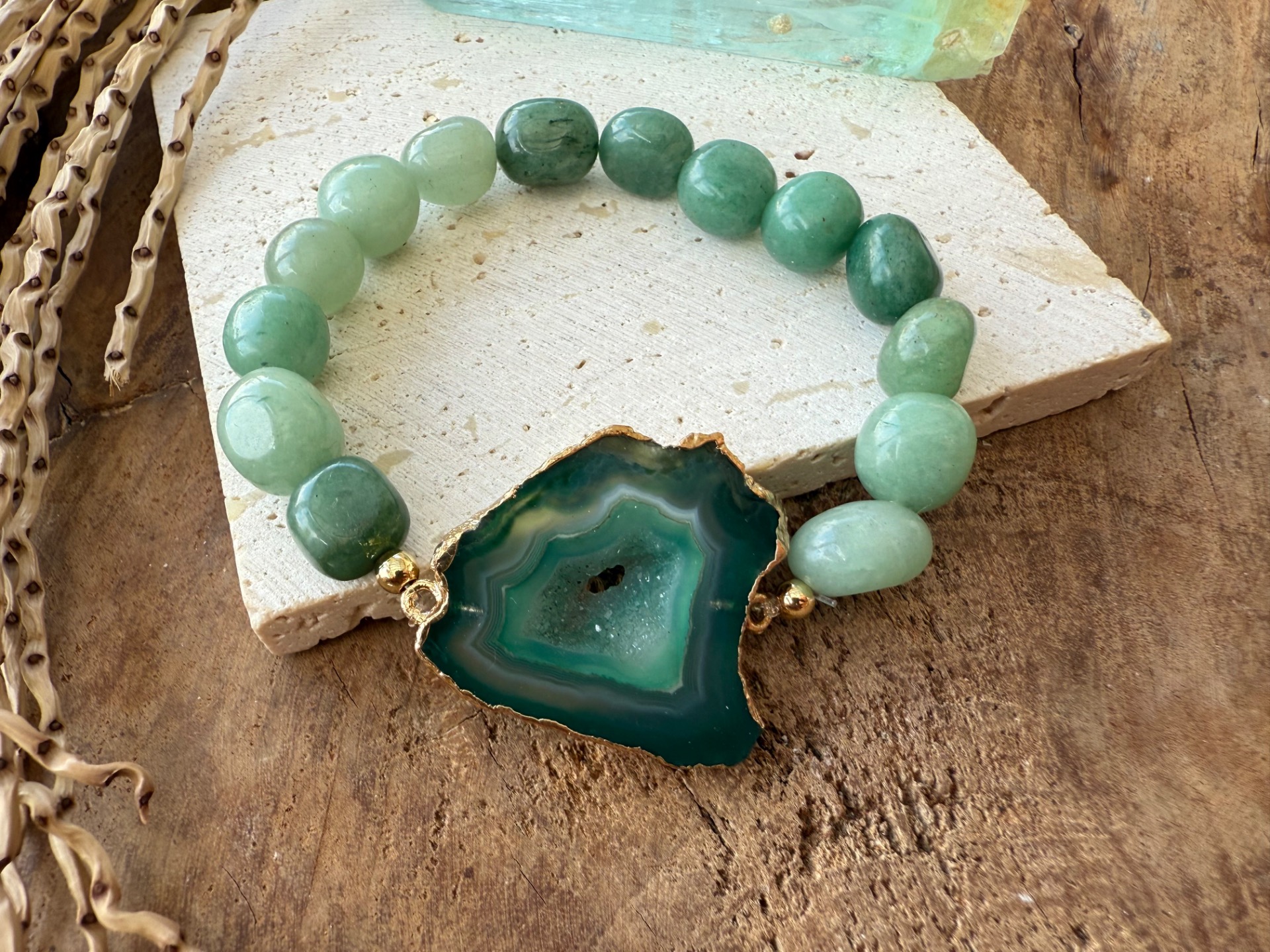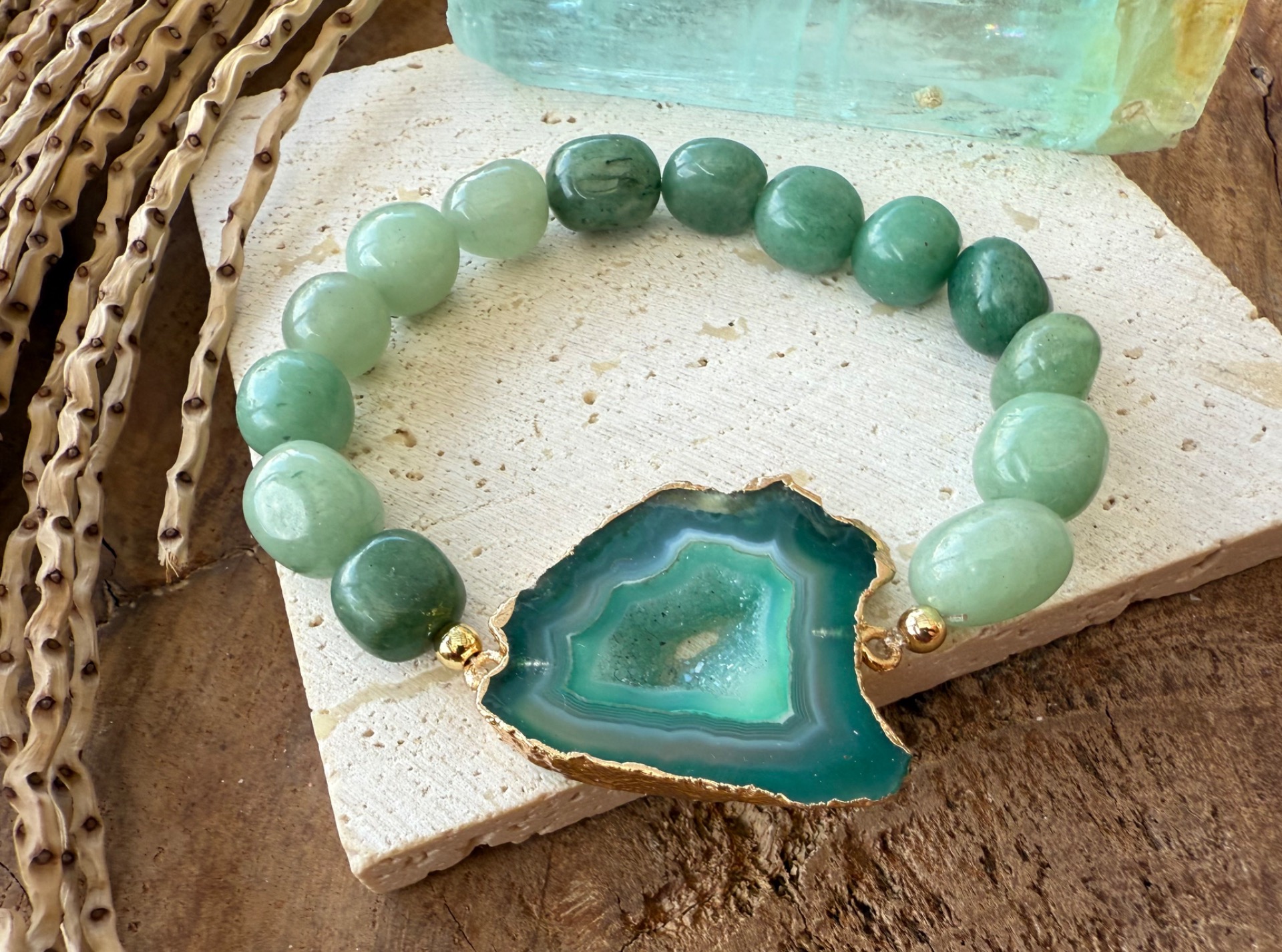 Zelený achát drúza – symbol uzemnenia a vnútornej istoty. Jeho kryštalická drúzová štruktúra vyžaruje jemné vibrácie pokoja a stability. Podporuje schopnosť zvládať stres, pomáha udržiavať rovnováhu v emóciách a otvára cestu k vnútornému mieru.