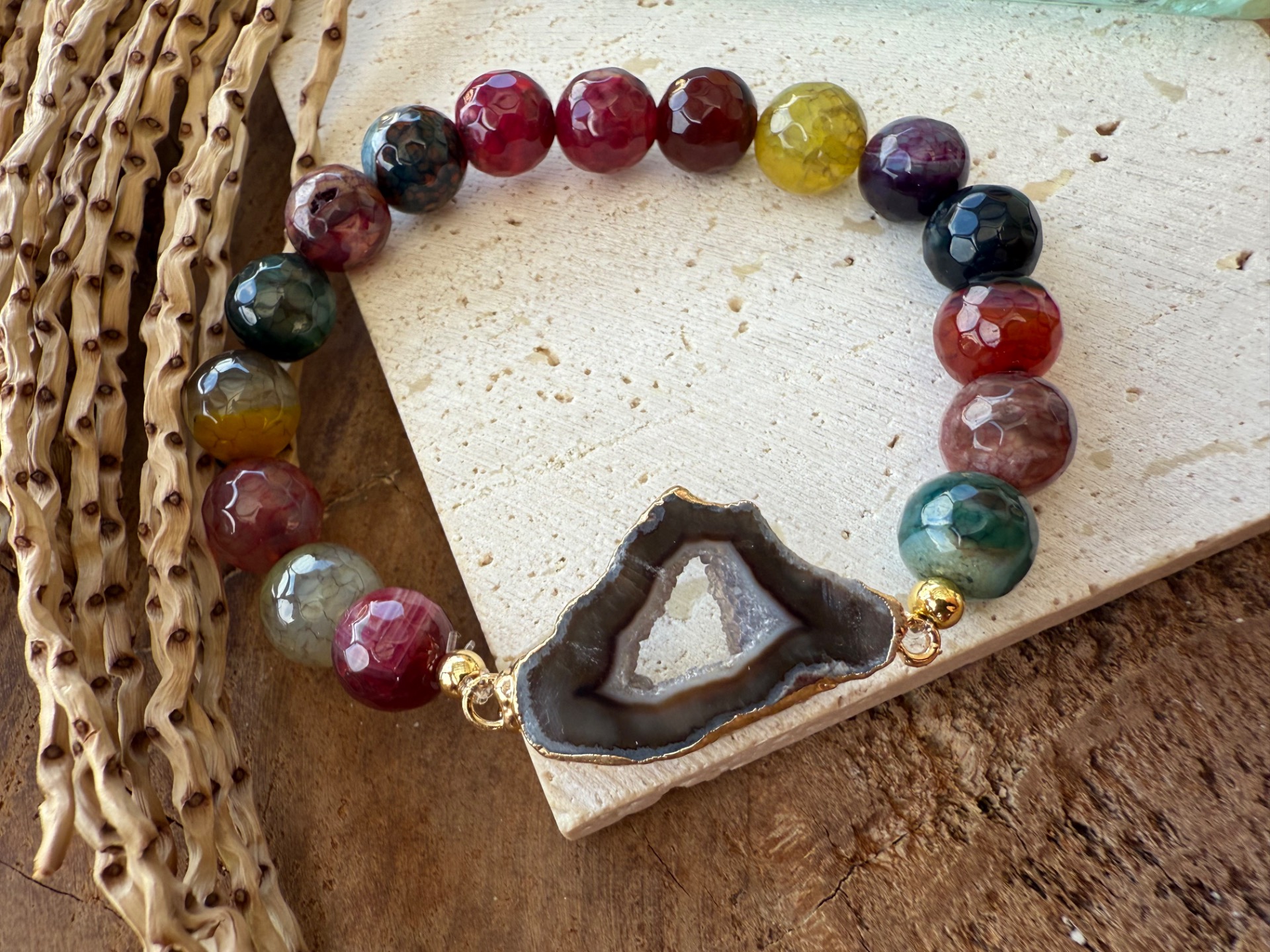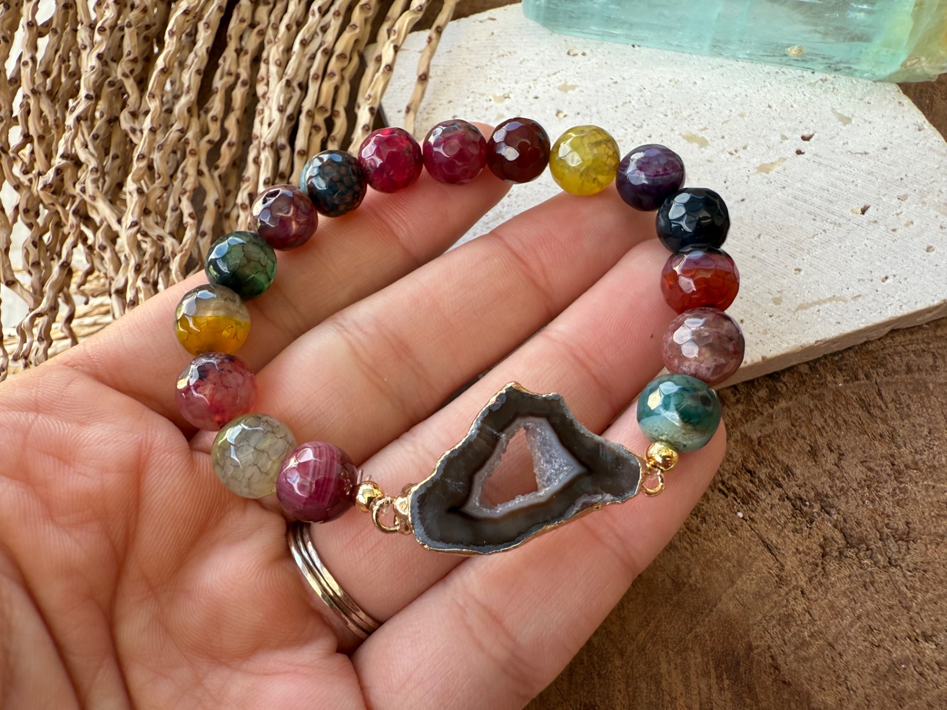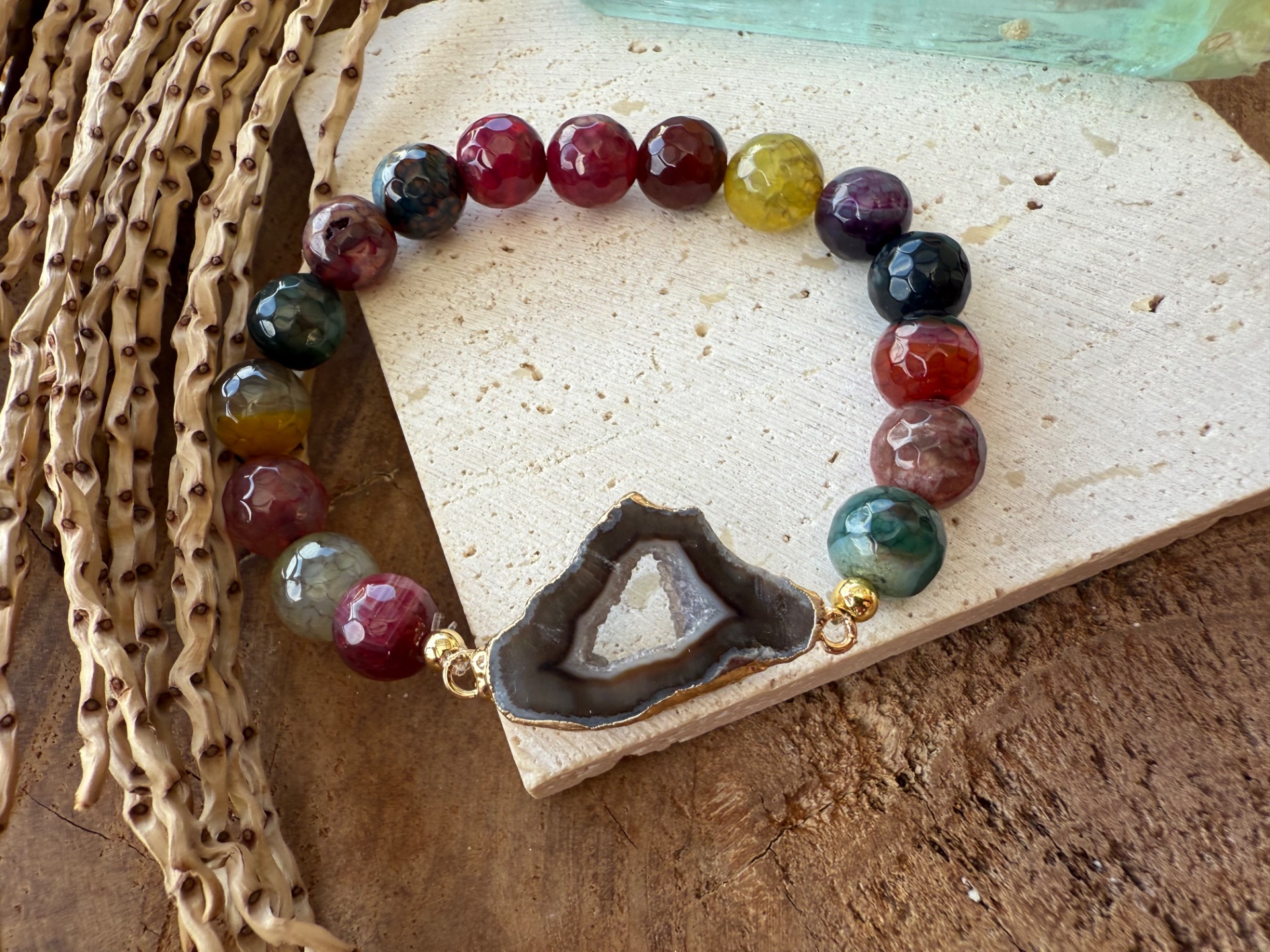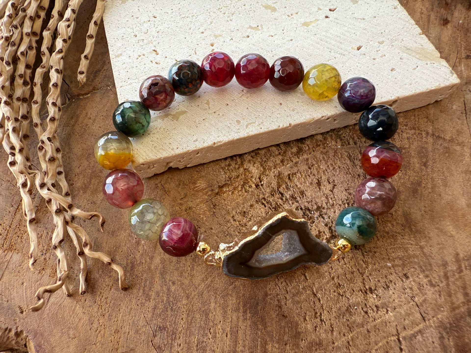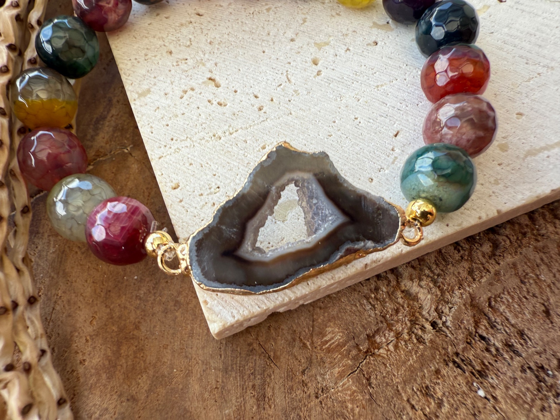 Kombinácia pestrofarebného achátu vo facetovanom výbruse a achátovej drúzy v hnedých tónoch vytvára energiu radosti, hravosti a vnútornej stability.