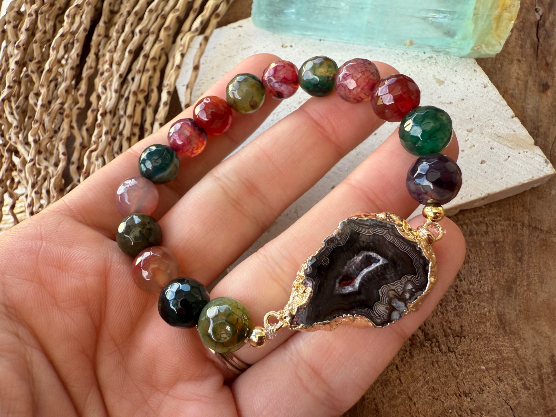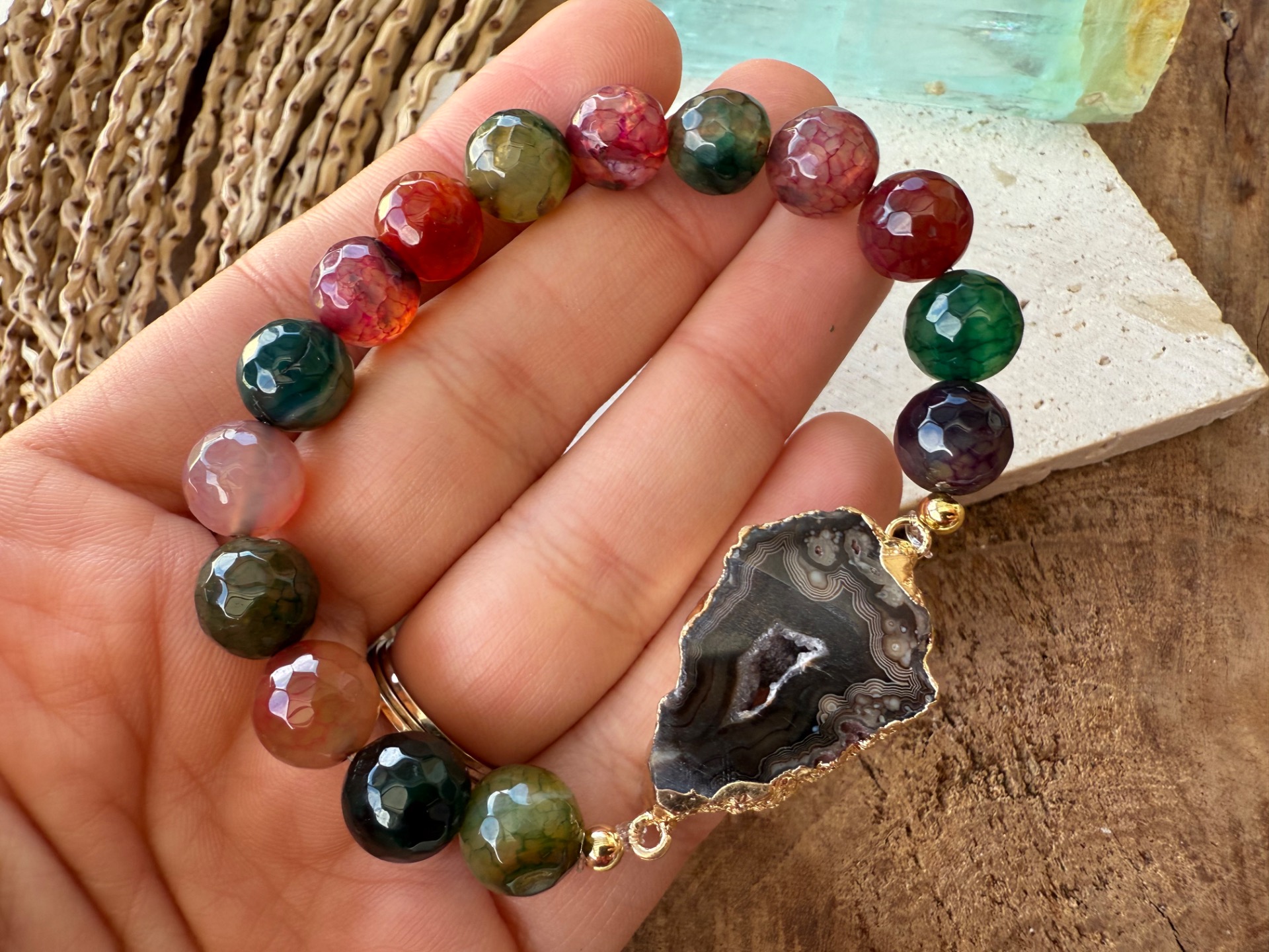 Kombinácia pestrofarebného achátu vo facetovanom výbruse a achátovej drúzy v hnedých tónoch vytvára energiu radosti, hravosti a vnútornej stability.