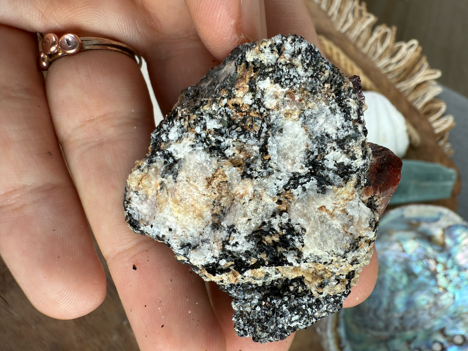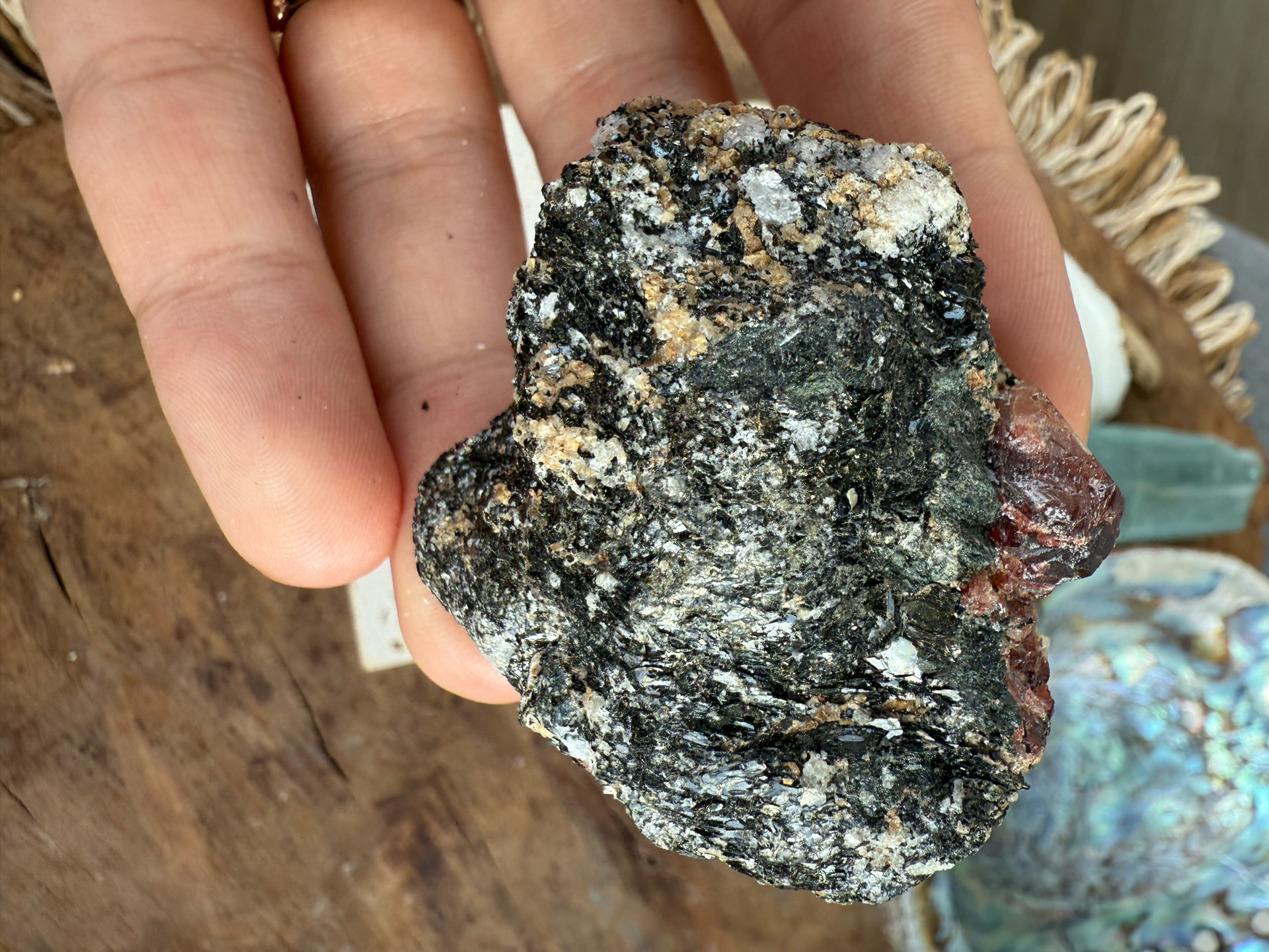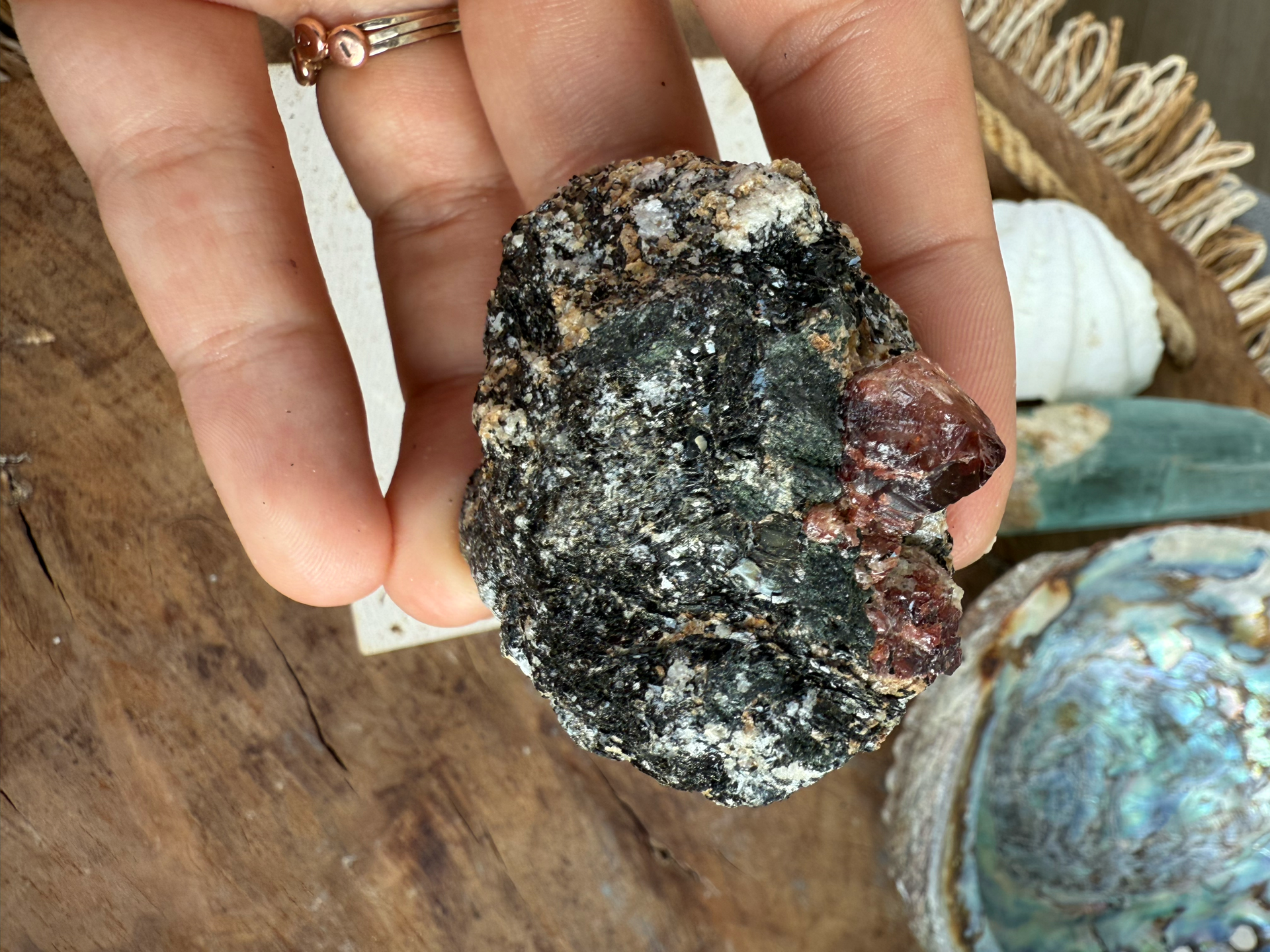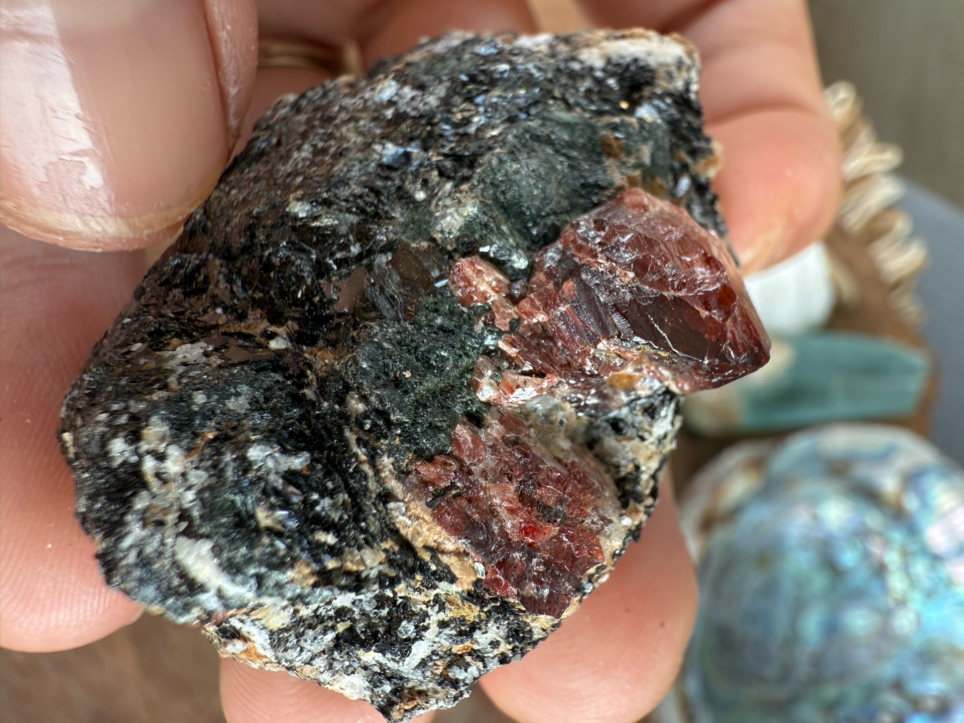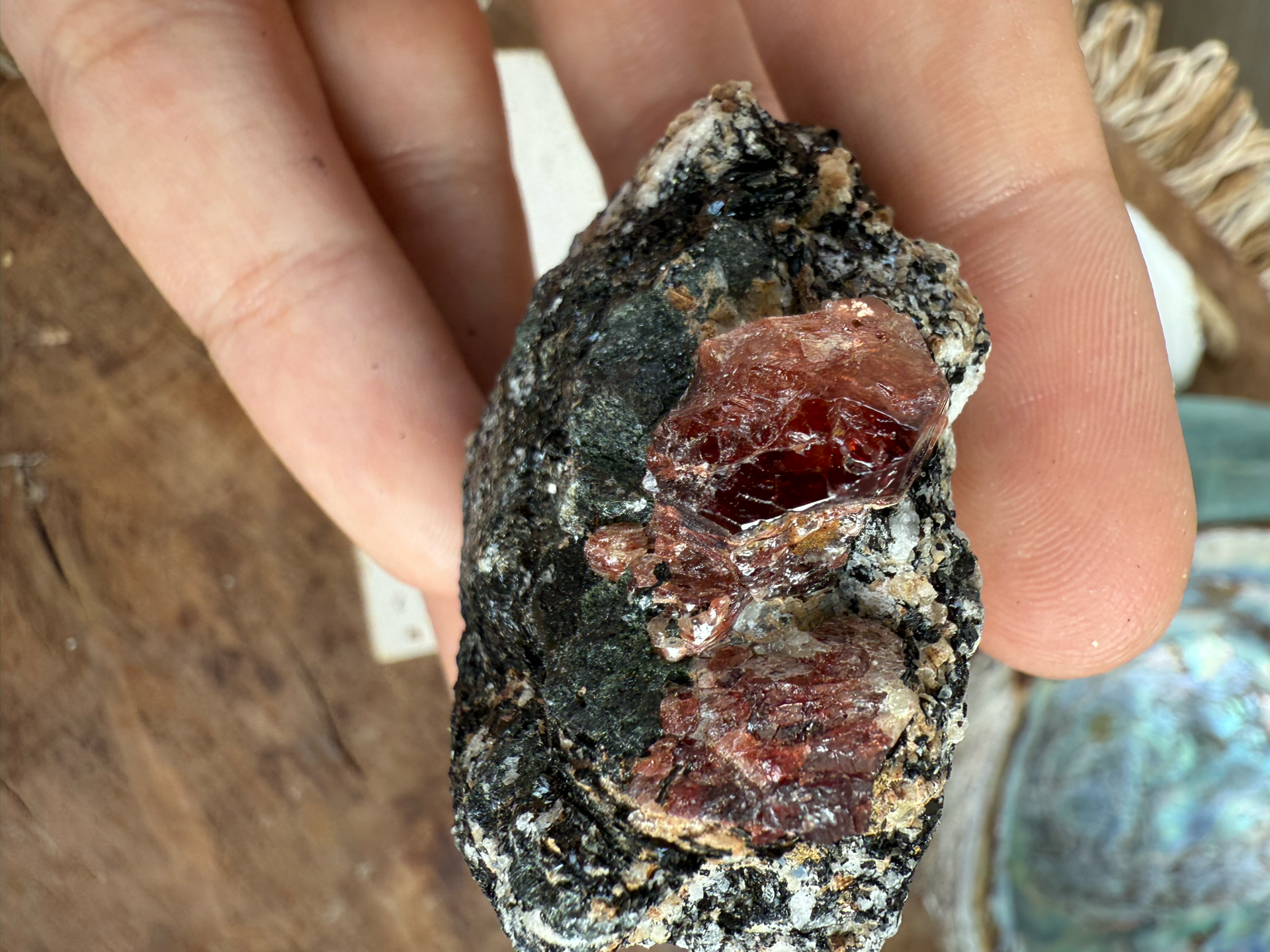 Jeho sýte červeno-krvavé odtiene žiaria v kontraste s horninou, z ktorej sa zrodil. Tento minerál v matrici pôsobí mimoriadne surovo, silno a pravdivo – ako by v sebe niesol samotný dych Zeme.